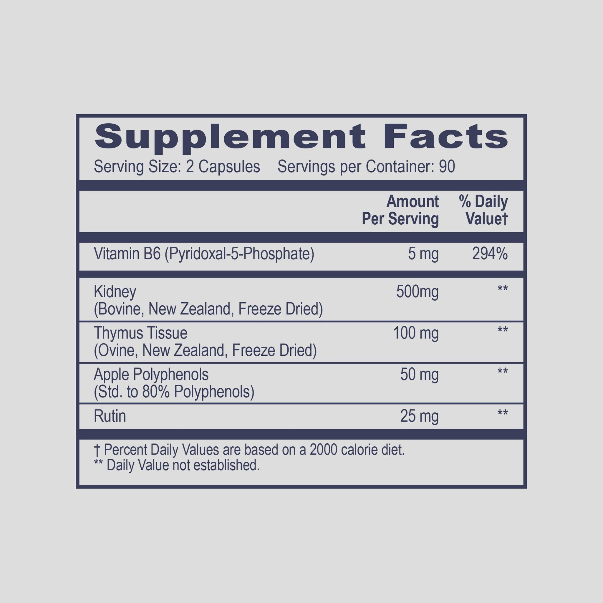 ABP1 Assist (HISTA/GUT) содержит диаминоксидазу (DAO) — фермент, естественным образом присутствующий в пищеварительном тракте, который способствует расщеплению гистамина.‡ В состав препарата также входят мощные полифенолы, ткани железы тимуса и почек, а также важный кофактор фермента DAO — витамин B6. Почки крупного рогатого скота также содержат диаминоксидазу (DAO), также известную как гистаминаза, фермент, участвующий в метаболизме, окислении и инактивации гистамина во всем организме. Этот продукт хорошо сочетается с Histamine Scavenger и MC Balancer для усиления эффекта поглощения гистамина.
