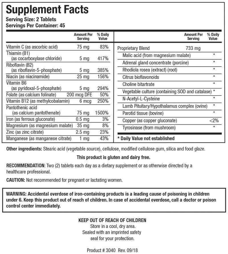 Vitamin C (as ascorbic acid); Thiamin (B1) (as cocarboxylase chloride); Riboflavin (B2) (as riboflavin-5-phosphate); Niacin (as niacinamide); Vitamin B6 (as pyridoxal-5-phosphate); Folate (as calcium folinate); Vitamin B12 (as methylcobalamin); Pantothenic acid (as calcium pantothenate); Iron (as ferrous gluconate); Magnesium (as magnesium malate); Zinc (as zinc citrate); Manganese (as manganese citrate); Proprietary Blend; Malic acid (from magnesium malate), Adrenal gland concentrate (porcine), Rhodiola rosea (extract) (root), Citrus bioflavonoids , Choline bitartrate, Vegetable culture (containing SOD and catalase), N-Acetyl-L-Cysteine, Lamb Pituitary/Hypothalamus complex (ovine), Parotid tissue (bovine), Copper (as copper gluconate), Tyrosinase (from mushroom)