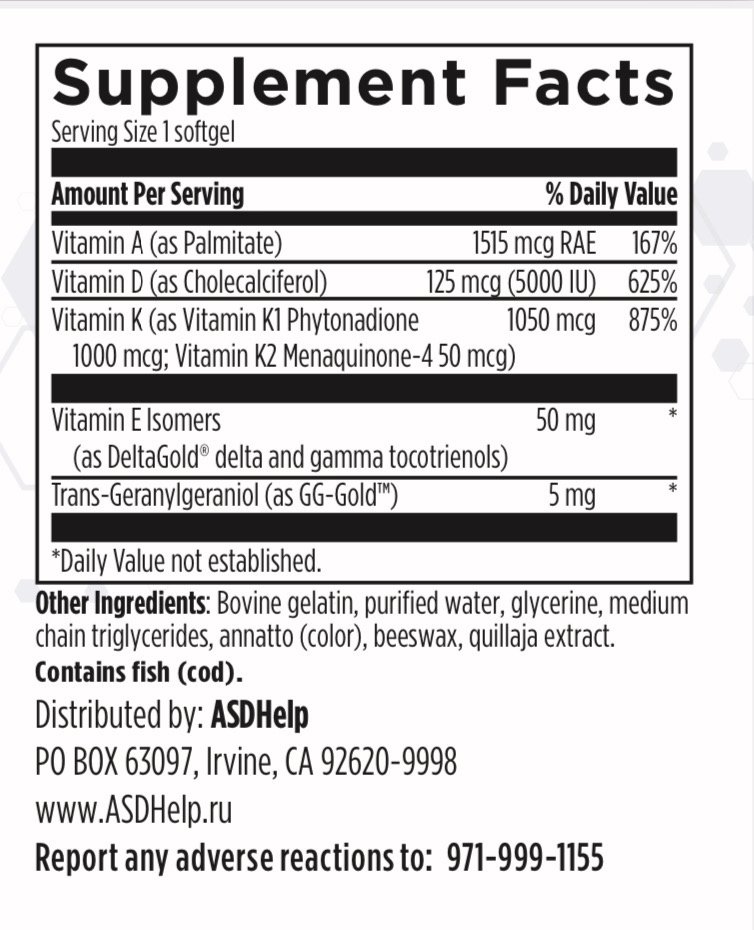 Эта формула разработана для поддержания баланса жирорастворимых витаминов в организме, а также для укрепления здоровья костей, сердца и иммунитета.