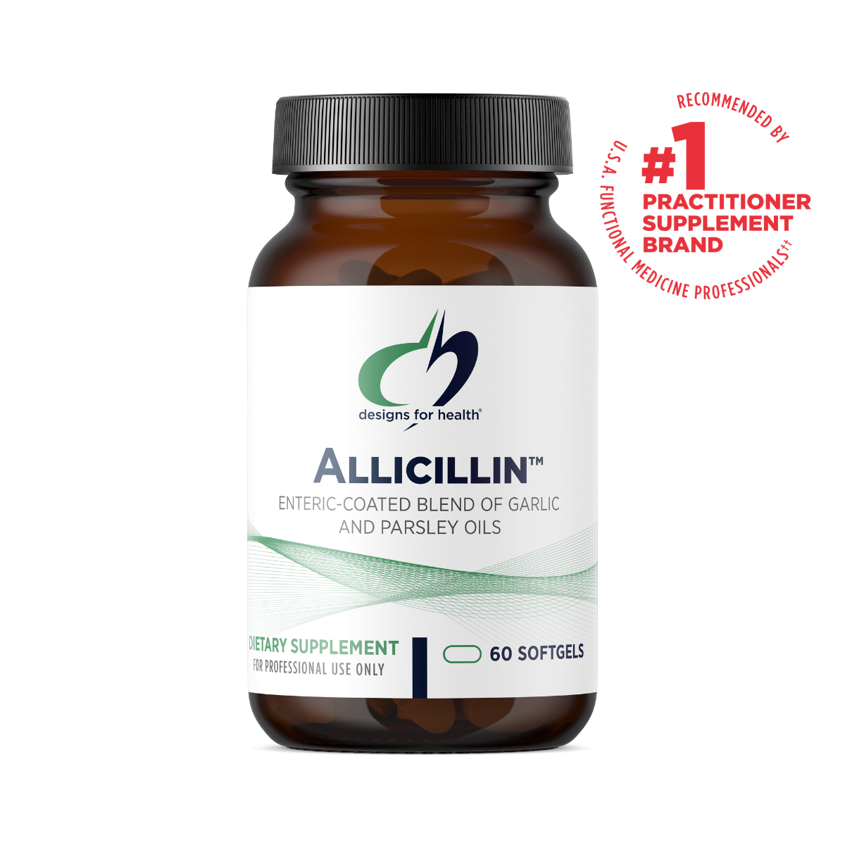 Мягкие таблетки Allicillin™ содержат Garlicillin™, смесь чесночного масла и масла петрушки с определенными уровнями сульфидов чеснока и аджоена, наиболее биоактивного соединения, образующегося из чеснока. Эти мягкие таблетки имеют энтеральное покрытие, что помогает уменьшить сильный чесночный запах и повторение, которое может возникнуть при приеме чеснока. Биоактивные соединения чеснока и петрушки поддерживают иммунитет и здоровье печени, а также способствуют формированию здоровой микробной среды в желудочно-кишечном тракте*
