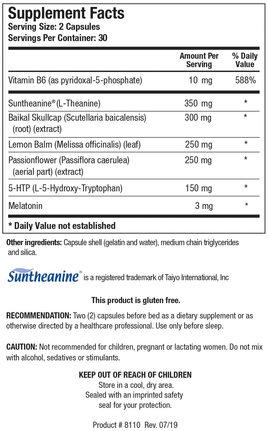 Витамин B6 (в виде пиридоксаль-5-фосфата), сунтеанин (L-теанин), байкальская тюбетейка (Scutellaria baicalensis) (корень) (экстракт), лимонный бальзам (Melissa officinalis) (лист), Passionflower (Passiflora caerulea) (воздушная часть) (экстракт), 5-HTP (L-5-гидрокси-триптофан), мелатонин