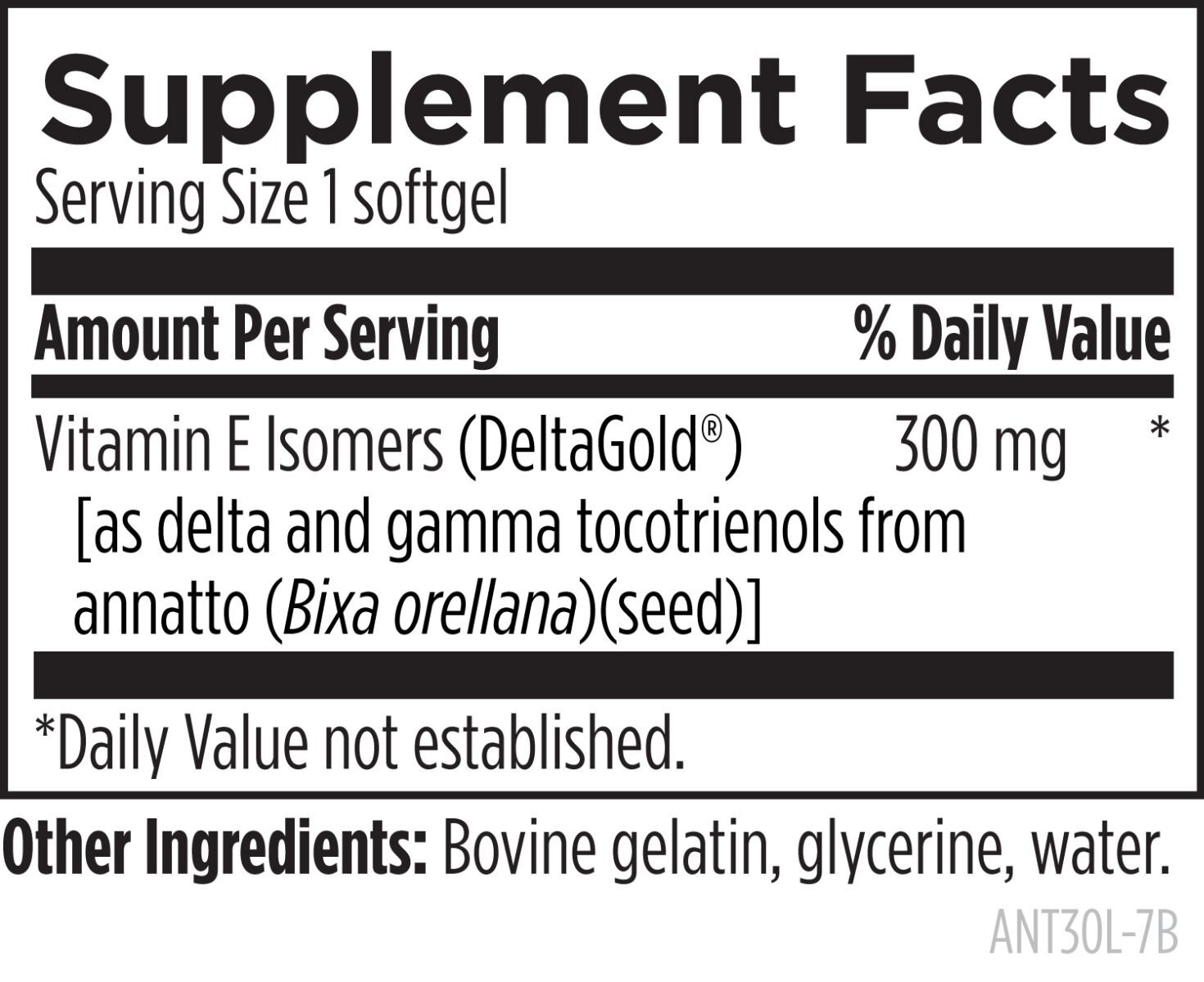 Annatto-E™ 300 - уникальный продукт, не содержащий токоферола и токотриенолов, в состав которого входят токотриенолы, полученные из дерева аннатто. Аннатто - самый богатый из известных источников токотриенолов, содержащий 100% токотриенолов (90% дельта-изомеров и 10% гамма-изомеров), без токоферолов. Annatto-E® 300 содержит 300 мг дельта/гамма токотриенолов в одном софтгеле. Коммерческие добавки витамина Е обычно богаты токоферолами и содержат мало токотриенолов или не содержат их вовсе. Однако фракции токотриенолов обладают уникальными полезными эффектами в различных тканях, что делает их востребованными для поддержки многих аспектов здоровья.* Исследования показывают, что токоферолы - особенно альфа-токоферол - могут препятствовать основным клиническим эффектам токотриенолов, поэтому лучше принимать токотриенолы отдельно, без токоферолов.* Рекомендации по применению: Принимайте по 1 мягкому гелю в день или по указанию вашего лечащего врача. * Эти заявления не были оценены Управлением по контролю качества пищевых продуктов и лекарственных средств. Данный продукт не предназначен для диагностики, лечения, излечения или профилактики каких-либо заболеваний.