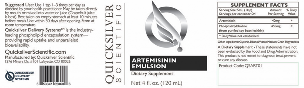 Каждая 0,5 мл эмульсии артемизинина содержит 40 мг артемизинина. Размер порции составляет 1 помпу. Каждый флакон содержит 40 порций по 50 мг.