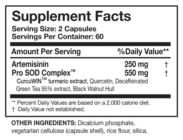 «Артемизинин СОД» содержит чистый артемизинин для поддержки иммунной системы, экстракт зеленого чая для активизирования здоровых уровней СОД (супероксиддисмутазы), куркумин и кверцетин для лечения воспаления и, как следствие, ингибирующего воздействия на белок NF kappa-B, и черная ореховая шелуха для вооружения антипаразитарных систем.