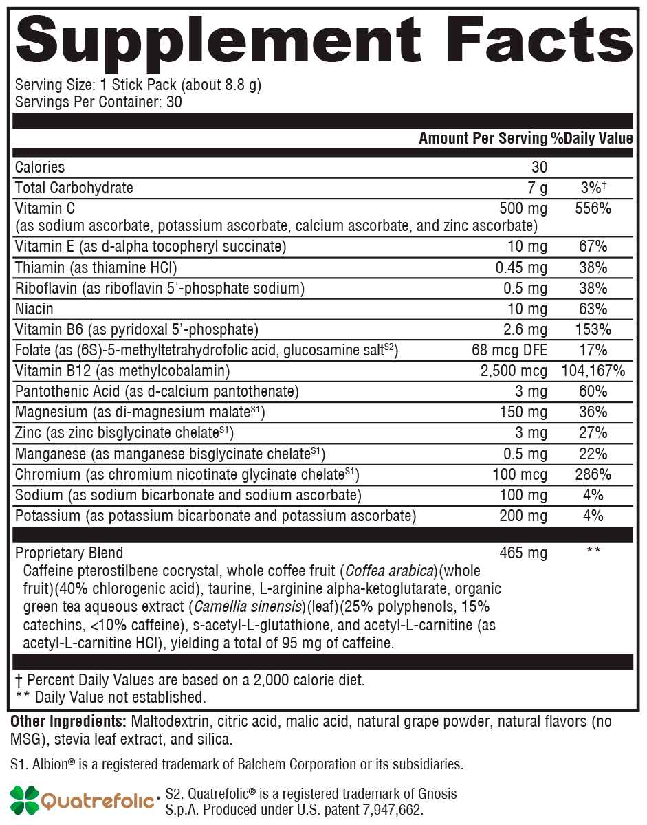 Эти порошковые пакеты с электролитами сочетают в себе витамины группы В, аминокислоты, микроэлементы и антиоксиданты для поддержания здорового уровня энергии и борьбы с окислительным стрессом. Кроме того, в них содержится кокристалл кофеина-птеростильбена, который может продлить действие кофеина, делая его более мягким и продолжительным. Содержащий всего 7 граммов углеводов, этот электролитный напиток идеально подходит для активного дня или послеобеденного затишья.*