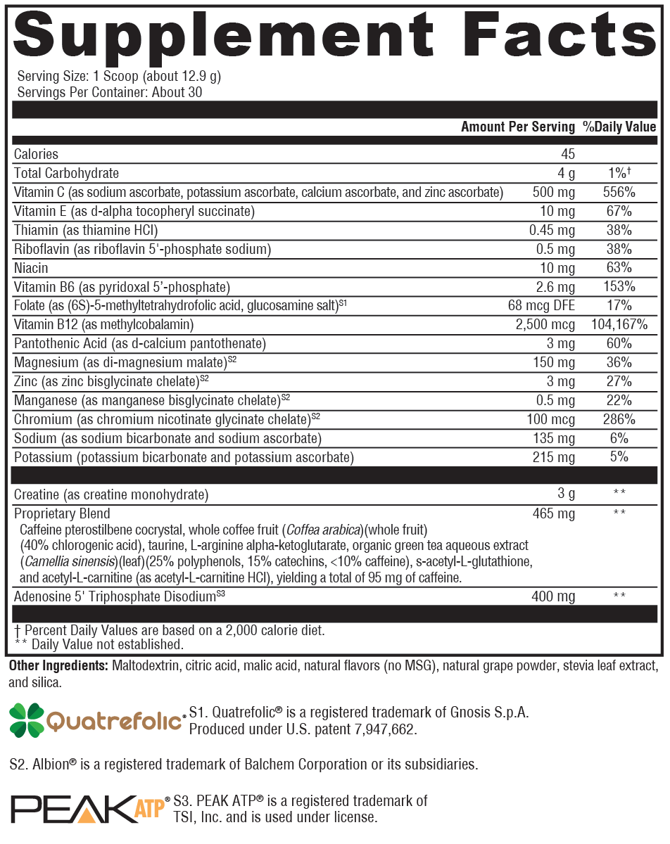 ATP Ignite™ Workout разработан для удовлетворения сложных потребностей организма во время и после тренировки. Этот великолепный на вкус напиток представляет собой низкоуглеводную, не содержащую сахара комбинацию биоактивных витаминов группы В, электролитов, хелатированных микроэлементов Albion®, ключевых аминокислот, трав, мощных антиоксидантов и уникальной смеси натуральных усилителей физической активности для повышения мышечной возбудимости и восстановления - без использования искусственных подсластителей*