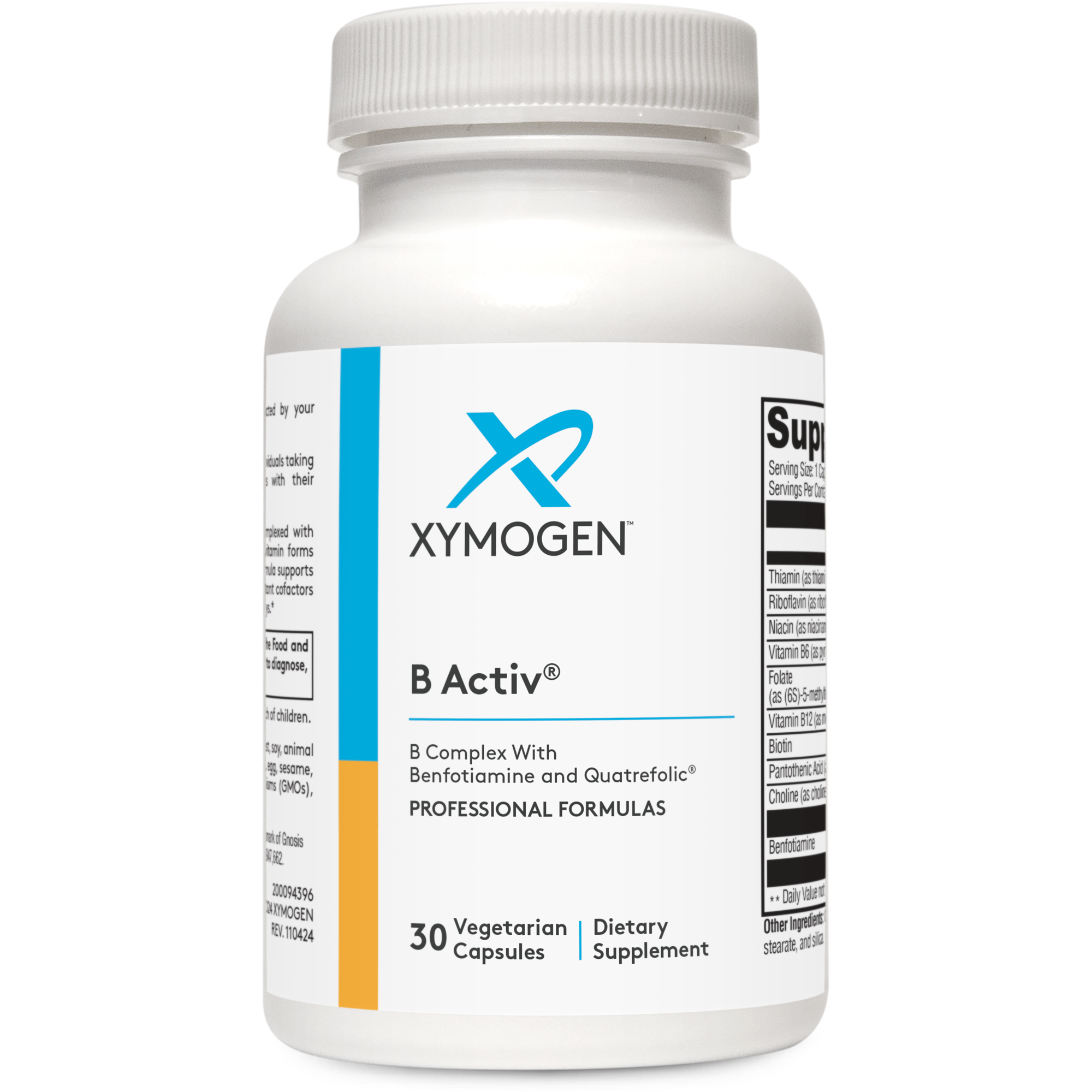 B Activ® содержит весь спектр витаминов группы B для поддержки функций надпочечников, неврологии и стресса. В состав входят активированные формы витаминов B2, B6 и B12; бенфотиамин, жирорастворимая, более физиологически активная форма тиамина; и фолат в форме Quatrefolic®, который обладает большей стабильностью, растворимостью и биодоступностью, чем кальциевые соли 5-MTHF*