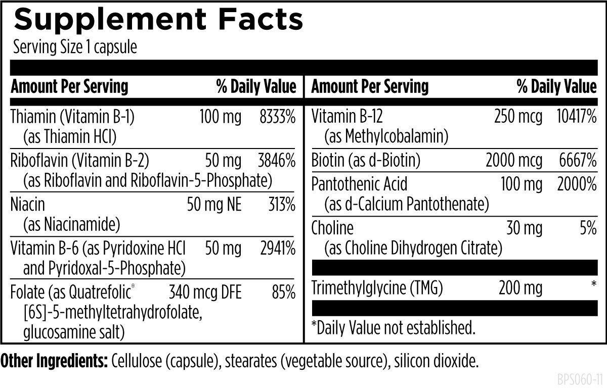 B-Supreme - это мощная комбинация витаминов группы В, поставляемых в основном в коферментных формах, благодаря чему организму не нужно фосфорилировать их для использования в биохимических реакциях. Эта формула также включает запатентованное производное фолата Quatrefolic®, которое является инновационной формой фолата, продемонстрировавшей высокую биодоступность, растворимость и длительную стабильность.* Триметилглицин (TMG) и холин также включены для поддержки метилирования.* Рекомендации по применению: Принимайте 1 капсулу в день во время еды или по указанию вашего лечащего врача.* Эти заявления не были оценены Управлением по контролю за продуктами и лекарствами. Данный продукт не предназначен для диагностики, лечения, излечения или профилактики каких-либо заболеваний.