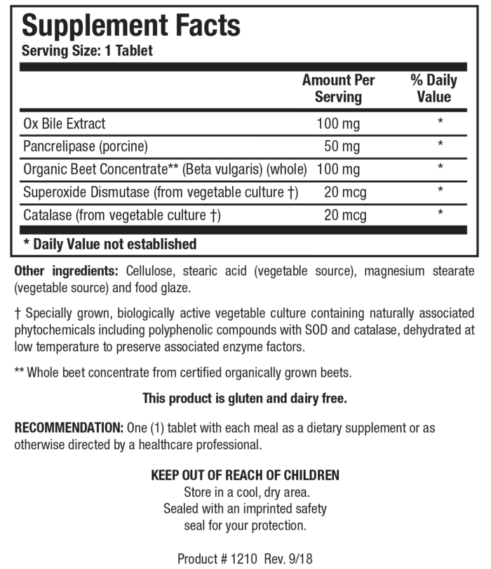 Экстракт желчи, панкрелипаза (свиная), органический свекольный концентрат** (Beta vulgaris) (цельный), супероксиддисмутаза (сырая органическая растительная культура†), каталаза (сырая органическая растительная культура†).