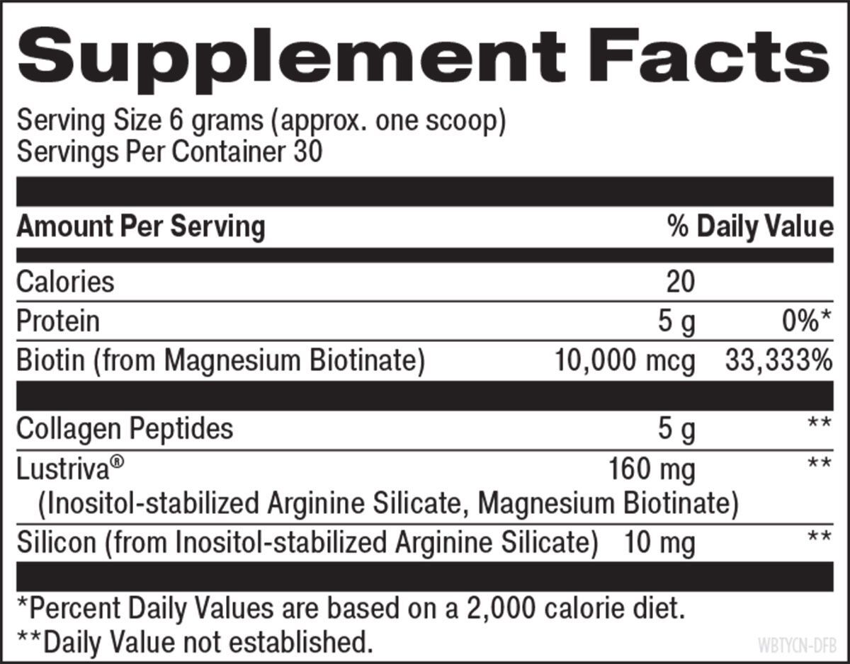 Beyond Brilliance™ - это удобный коллагеновый порошок с высоким содержанием биотина, который уникальным образом сочетает в себе ключевые питательные вещества для сияющих волос, кожи и ногтей.* Он содержит гидролизованные пептиды коллагена и Lustriva®, запатентованную, клинически исследованную смесь стабилизированного биотина и кремнезема. По имеющимся данным, Lustriva® может способствовать увеличению объема волос, оптимальной текстуре и увлажнению кожи, а также укреплению ногтей.* Этот неароматизированный и несладкий порошок оптимально подходит для смешивания с жидкостями, чтобы помочь вам сиять и поддерживать изнутри.*