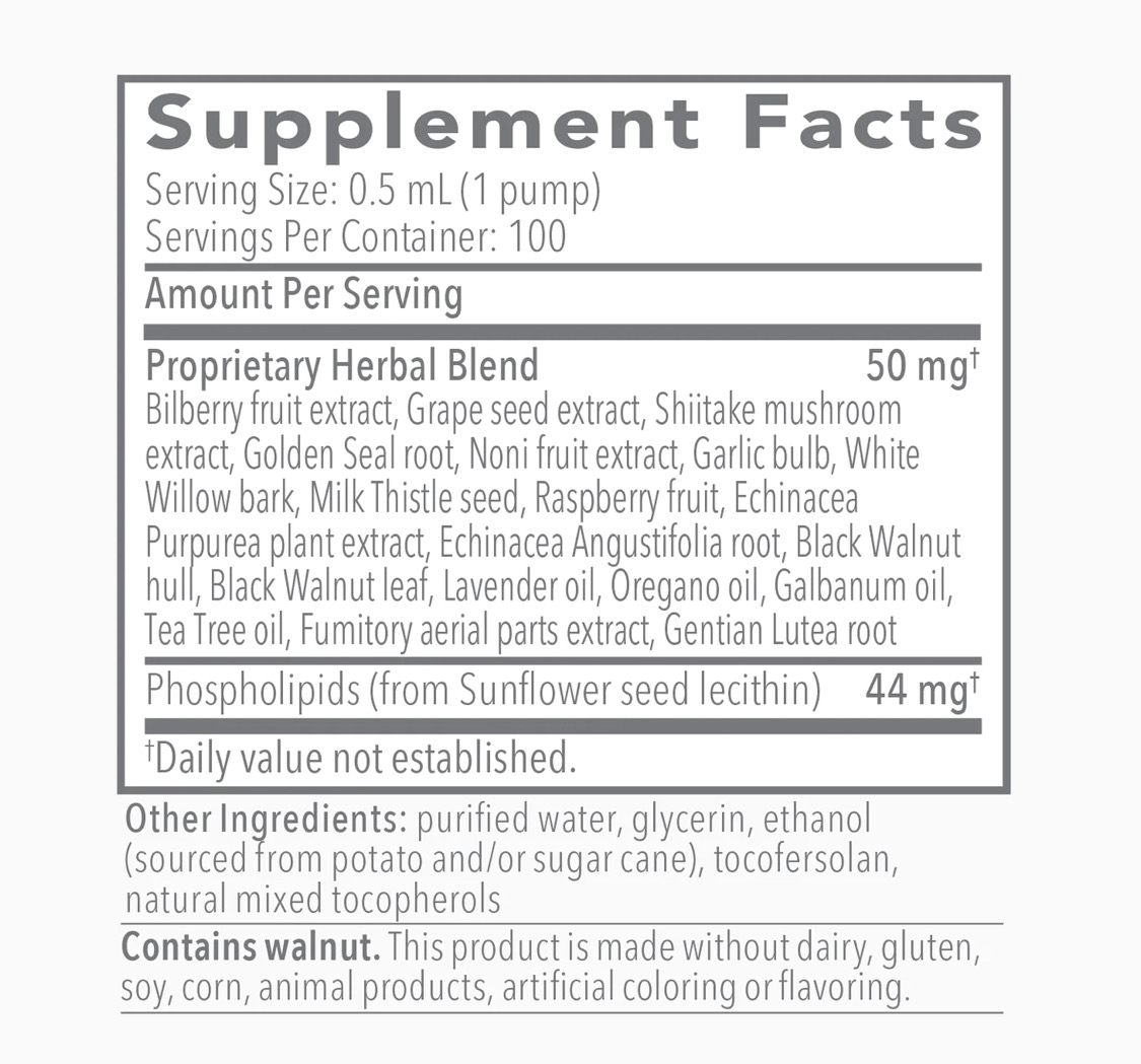 Запатентованная травяная смесь: экстракт черники (25% антоцианозидов), нони, расторопша, эхинацея (пурпурная и узколистная), Goldenseal, шиитаке, белая ива (кора), чеснок, экстракт виноградных косточек (минимум 90% полифенолов), черный грецкий орех (шелуха и листьев), малины, фуминоры, горечавки, масла чайного дерева, масла гальбанума, масла лаванды (растения и цветы), масла душицы (растения и цветы).