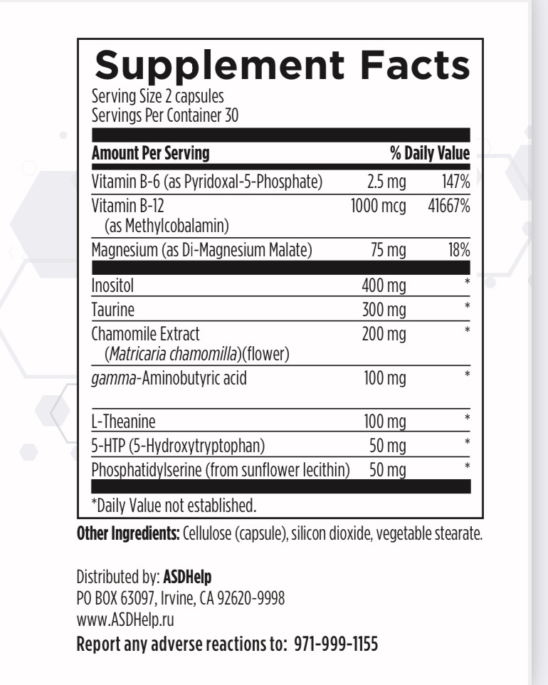 содержит PharmaGABA®, форму ГАМК, полученную естественным путем процесса ферментации, который считается более эффективным, чем химически произведенные синтетические формы. Поддержка производства успокаивающих нейротрансмиттеров также обеспечивается L-теанином и таурином