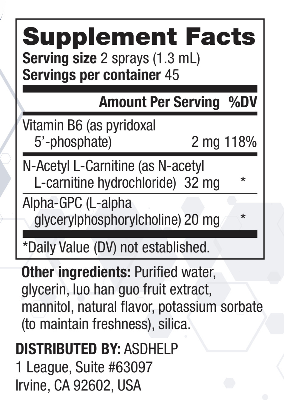 Brain Tonic предназначен для поддержки холинергической системы в уникальном пероральном спрее N-ацетил L-карнитина, альфа-GPC и активной формы витамина B6 (пиридоксаль 5'-фосфат).