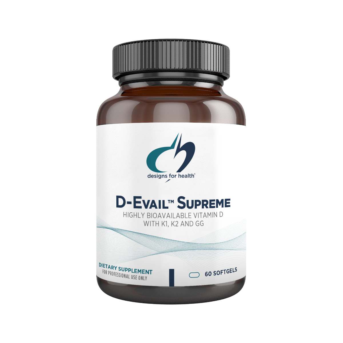 D-Evail™ Supreme содержит клинически значимую порцию витамина D в количестве 5 000 МЕ (125 мкг) в хорошо усваиваемой форме, а также витамины K1 и K2 (в виде MK-4) и геранилгераниол (GG) для поддержки костного, иммунного и сердечно-сосудистого здоровья.* Исследования показывают, что комбинированный прием витаминов D и K может быть более полезен для здоровья костей и сердечно-сосудистой системы, чем прием одного из витаминов в отдельности.* В этом продукте используется системная технология Evail™ от Designs for Health, которая сочетает экстракт хиладжи со среднецепочечными триглицеридами (MCT) для улучшения биодоступности питательных веществ.*