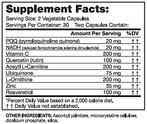 Пирролохинолин хинон(PQQ) и НАДН (B3) являются двумя основными ингредиентами, которые образуют эту мощную добавку. Сочетание этих 9 ингредиентов, отобранных нашими врачами-консультантами, гарантирует, что эти ключевые ингредиенты стимулируют правильную функцию митохондрий и защищают их от дегенерации.