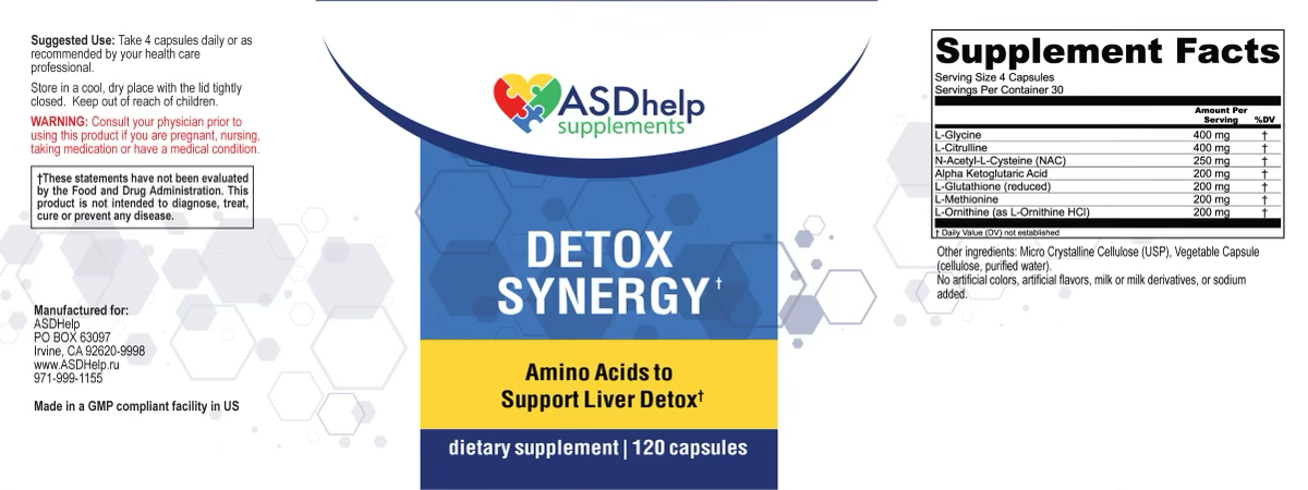 - DETOX SYNERGY является идеальным дополнением к любой программе детоксикации. Он отлично подходит для тех, кто хочет поддержать пути детоксикации II фазы, и может даже использоваться при подготовке к интенсивному протоколу детоксикации / очищения.