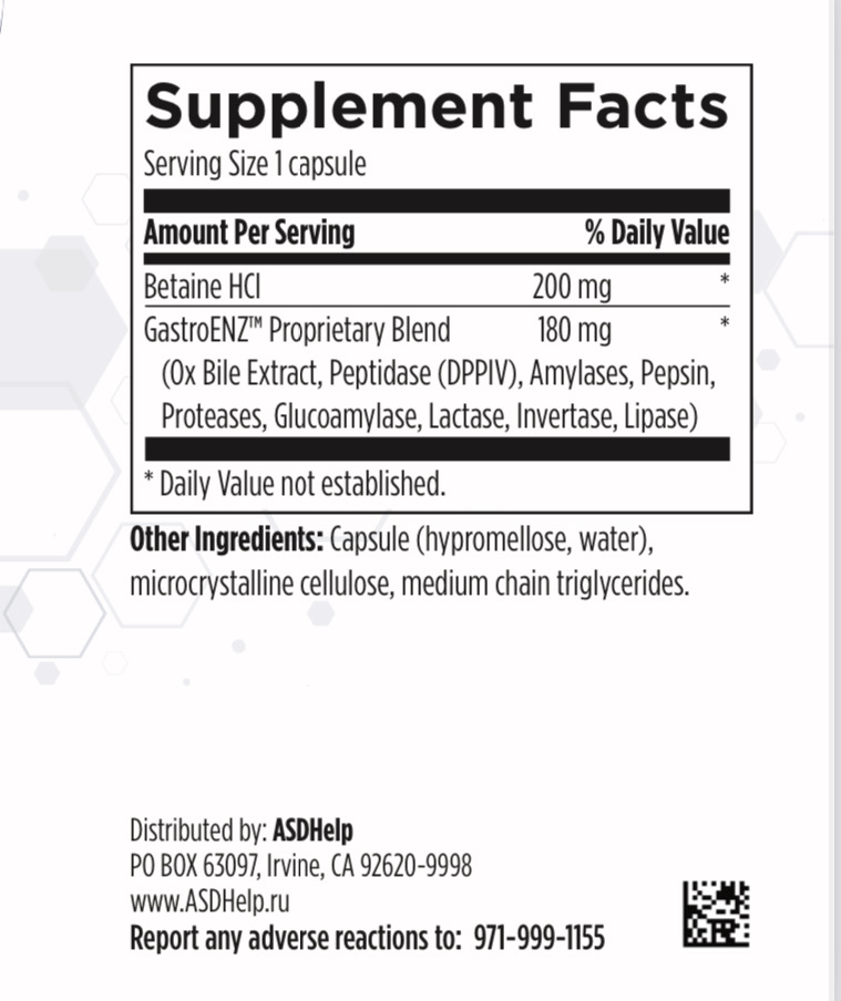 Digestive enzymes with HCI + Ox bile - это формула, состоящая из запатентованной смеси пищеварительных ферментов и бетаина гидрохлорида (HCl) для поддержания оптимального усвоения белков, жиров и углеводов.