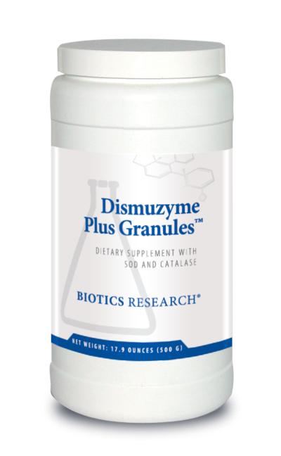 Dismuzyme Plus Granules™ содержит супероксиддисмутазу (СОД) и каталазу, полученные из запатентованной растительной культуры Biotics Research Corporation. Свободные радикалы вызывают биологические повреждения, как правило, в результате окислительных процессов. СОД является основным ферментом, уничтожающим свободные радикалы в организме человека. Она преобразует супероксидные радикалы в перекись водорода и кислород. Аналогичным образом каталаза преобразует перекись водорода в кислород и воду, дополняя тем самым деятельность СОД. Эти действия являются важнейшей частью клеточного механизма антиоксидантной защиты, и благодаря этой функции данные соединения играют роль в замедлении процесса старения. Dismuzyme Plus™ поставляет эту запатентованную растительную культуру в гранулированном виде, предлагая, таким образом, мощную форму этих двух антиоксидантных ферментов.