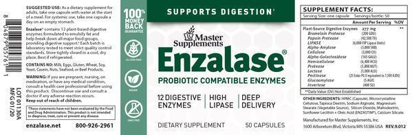 Энзалаза содержит 6000 единиц липазы FIP. Липаза является жизненно важным пищеварительным ферментом для жиров, позволяя другим ферментам работать более эффективно, устраняя закупорку жира.