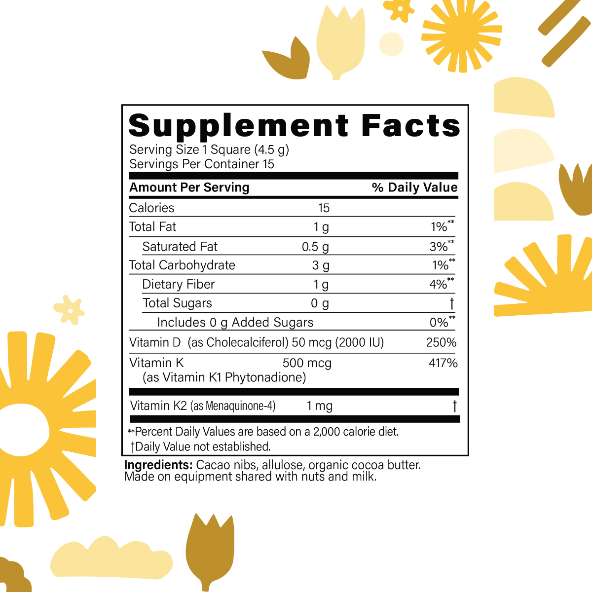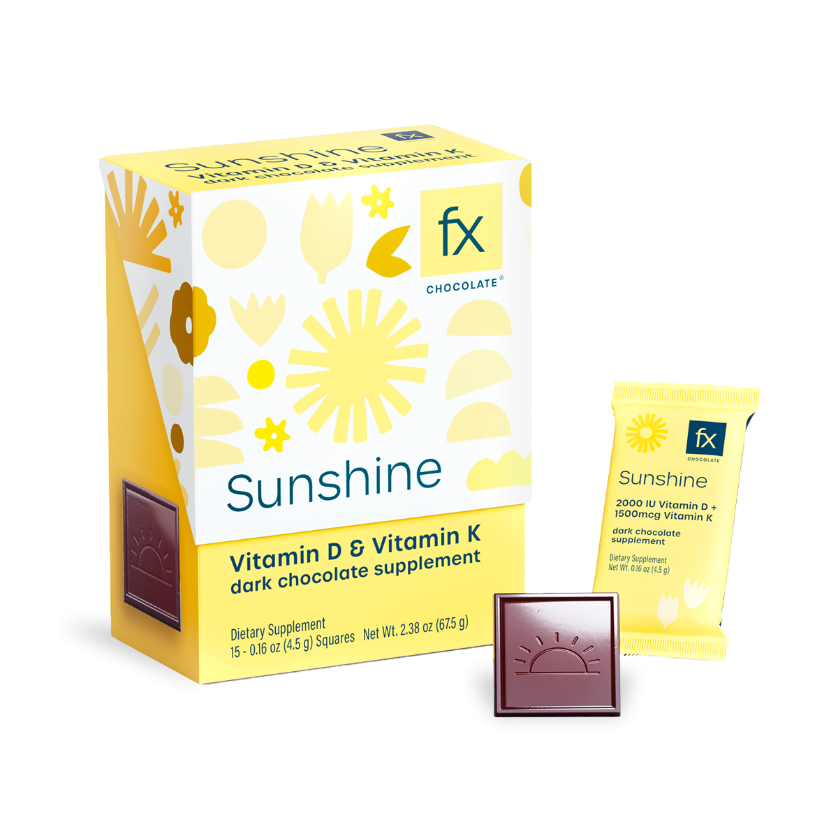 Fx Sunshine - это синергетическая смесь витамина D и биодоступных форм витамина K в 60% темном шоколаде, предназначенная для укрепления костного и сердечно-сосудистого здоровья, иммунной функции и позитивного психического настроя.* Эта формула сочетает в себе 50 мкг (2000 МЕ) витамина D3, 1 мг витамина K2 (в виде MK-4) и 500 мкг витамина K1 на 1 квадратную порцию. Эта комбинация витаминов D и K может помочь сбалансировать потребности организма в кальции, способствуя укреплению костей и поддерживая иммунное здоровье.* Fx Chocolate® содержит ноль граммов сахара и подслащен аллюлозой, подсластителем, который естественным образом содержится в джекфруте, инжире и изюме, без горечи или неприятного послевкусия.Изготовлен на оборудовании, совместно используемом с орехами и молоком.Рекомендации по применению: Употребляйте один квадратик Fx Sunshine один раз в день. Не превышайте рекомендуемую дозу.Предупреждение: Проконсультируйтесь с вашим лечащим врачом перед использованием этого продукта, если вы принимаете кумадин, варфарин или другие антикоагулянтные препараты.* Эти заявления не были оценены Управлением по контролю качества пищевых продуктов и лекарственных средств. Данный продукт не предназначен для диагностики, лечения, излечения или профилактики каких-либо заболеваний.