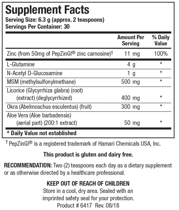 Цинк (из 50 мг карнозина цинка PepZinGI®) †, L-глутамин, N-ацетил D-глюкозамин, МСМ (метилсульфонилметан), солодка (Glycyrrhiza glabra) (корень) (экстракт) (деглицирризированный), Okra (Abelmoschus) ), Алоэ Вера (Aloe barbadensis) (надземная часть) (экстракт 200: 1).