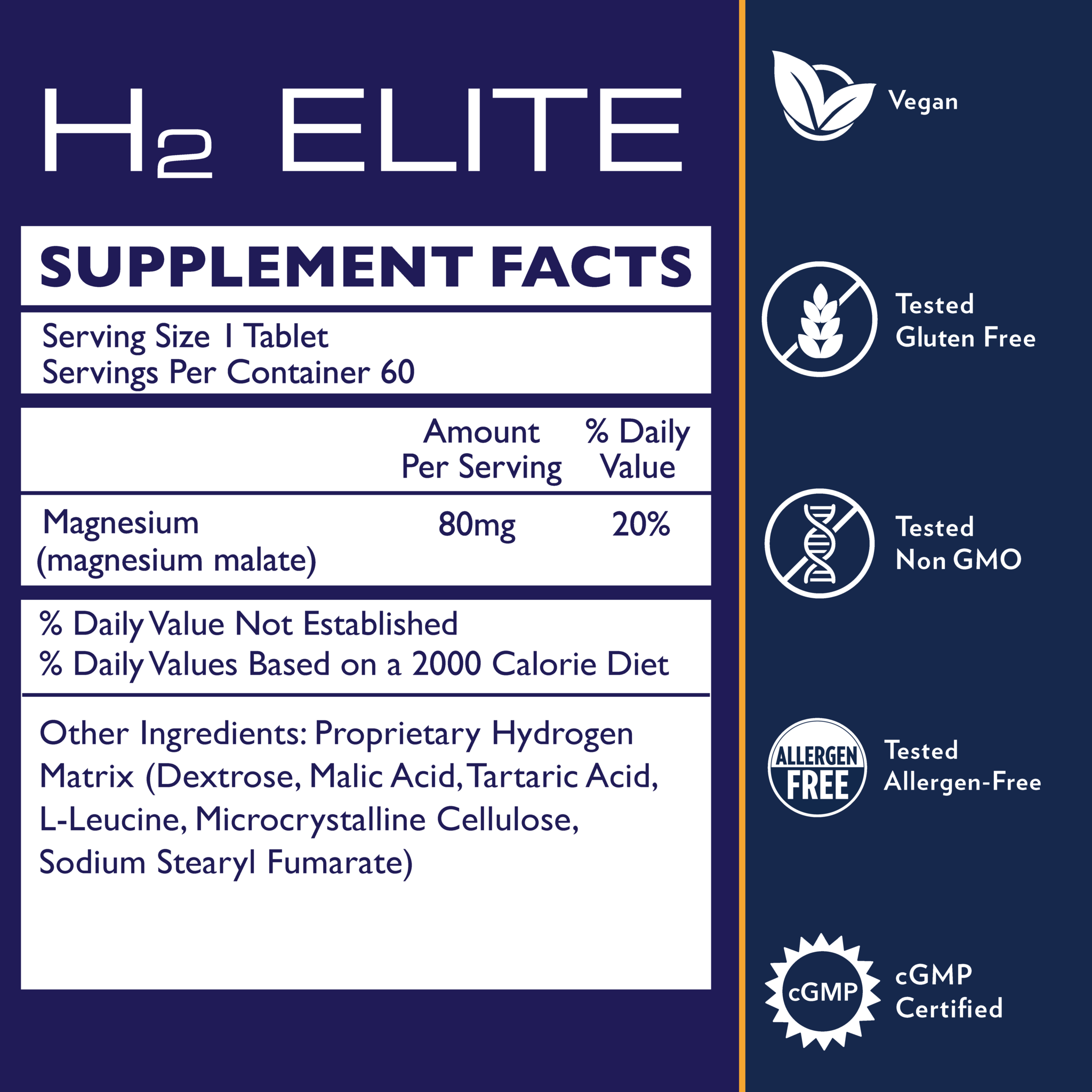 Каждая таблетка H2 Elite содержит 80 мг малата магния в запатентованной водородной основе. Размер порции составляет 1 таблетку. В каждой бутылке содержится 60 порций по 80 мг.