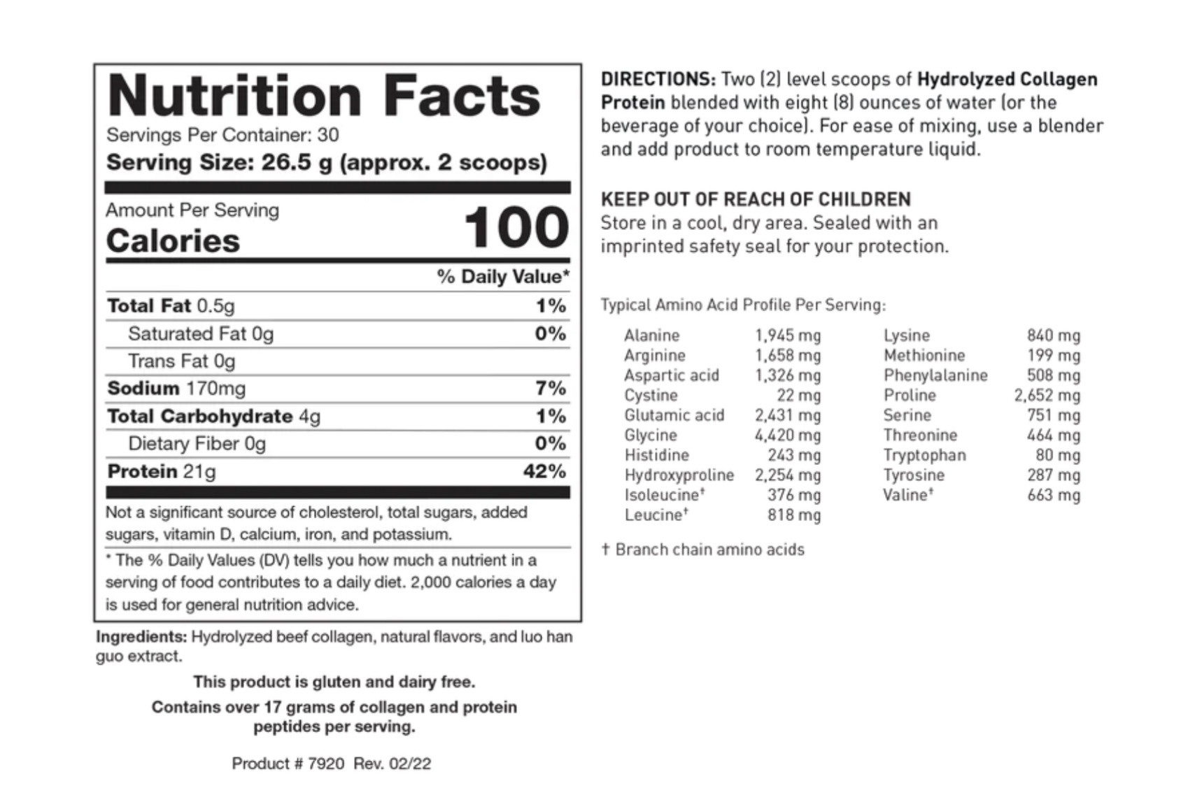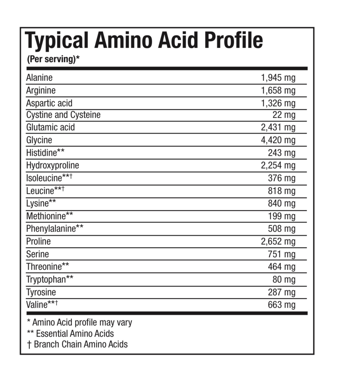 Этот протеиновый порошок содержит 21 грамм белка на порцию, а также пептиды коллагена типов I, II и III. Основная структура коллагена представляет собой тройную спираль, состоящую из трех альфа-цепочек, состоящих в основном из глицина, пролина и гидроксипролина. Различия в типах коллагена обусловлены особым расположением аминокислот в альфа-нитях, образующих тройную спираль. Коллаген I типа часто встречается в коже, костях, сухожилиях, связках, сосудистых перевязках и органах. Тип II содержится в основном в хрящах. Тип III чаще всего встречается в тканях с эластичными свойствами и в волокнистом белке в костях, хрящах, сухожилиях и других соединительных тканях.