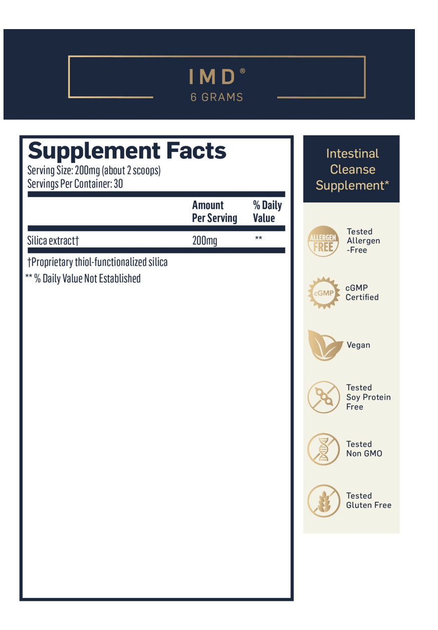 Выведение металлов поддерживает здоровье кишечника и уменьшает его воспаление. Это помогает полностью поддержать пути детоксикации. Как кремнеземная основа, так и связывающие агенты в IMD являются GRAS (Generally Recognized as Safe) для использования в продуктах питания.