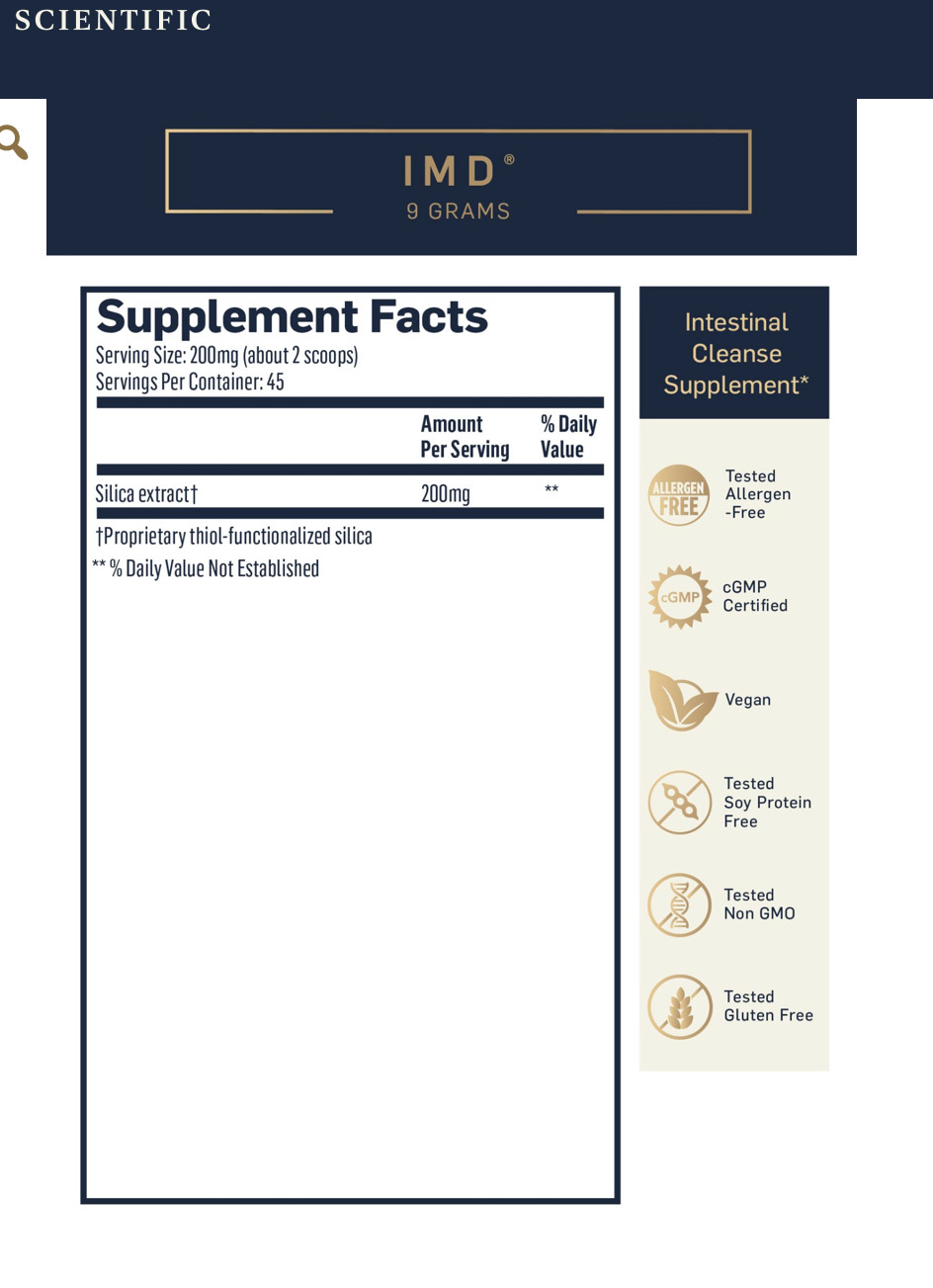 Выведение металлов поддерживает здоровье кишечника и уменьшает его воспаление. Это помогает полностью поддержать пути детоксикации. Как кремнеземная основа, так и связывающие агенты в IMD являются GRAS (Generally Recognized as Safe) для использования в продуктах питания.