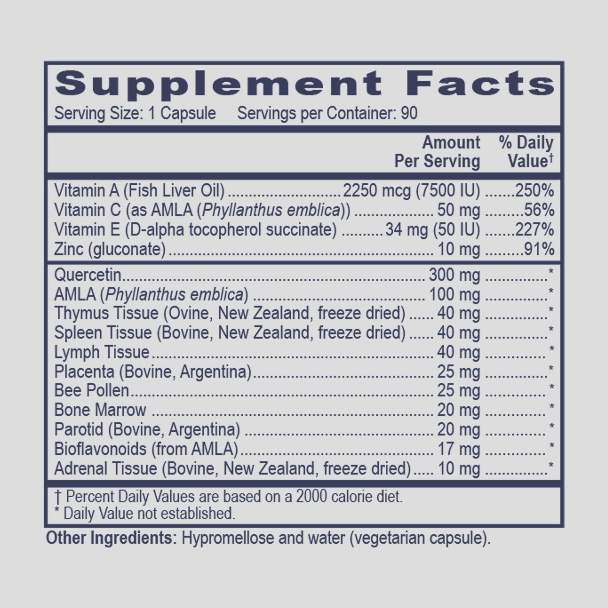 Иммунокомплекс содержит целевые группы витаминов, минералов, растительных веществ. В состав этого продукта входят: Концентрат тканей надпочечников, лимфы, плаценты, околоушной железы, тимуса и селезенки, а также костного мозга и пчелиной пыльцы. Ключевые витамины и минералы, включая витамин А в активной форме из жира рыбьей печени; витамины С и Е, мощные антиоксиданты, а также цинк и кверцетин. Для дополнительной поддержки можно добавить AMLA-C, Viroplex, хелат бисглицината цинка TRAACS®.