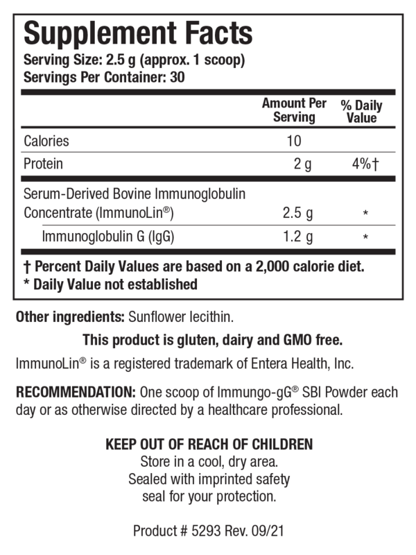 Immuno-GG® SBI - это безмолочная формула концентрата иммуноглобулина, предназначенная для поддержания здорового пищеварения и иммунной функции. Этот очищенный источник иммуноглобулина G (IgG) получен из сыворотки крупного рогатого скота, что делает его свободным от лактозы, казеина и β-лактоглобулинов.