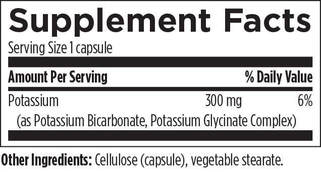 K+2 Potassium - это уникальный препарат калия, состоящий из бикарбоната калия и калия, связанного с аминокислотой глицином, что обеспечивает оптимальную потенцию, стабильность и переносимость продукта. Эта ощелачивающая формула обеспечивает питательную поддержку для поддержания здорового уровня кровяного давления.* Рекомендации по применению: принимайте по 1 капсуле в день или по указанию вашего лечащего врача.* Эти заявления не были оценены Управлением по контролю качества пищевых продуктов и лекарственных средств. Данный продукт не предназначен для диагностики, лечения, излечения или профилактики каких-либо заболеваний.
