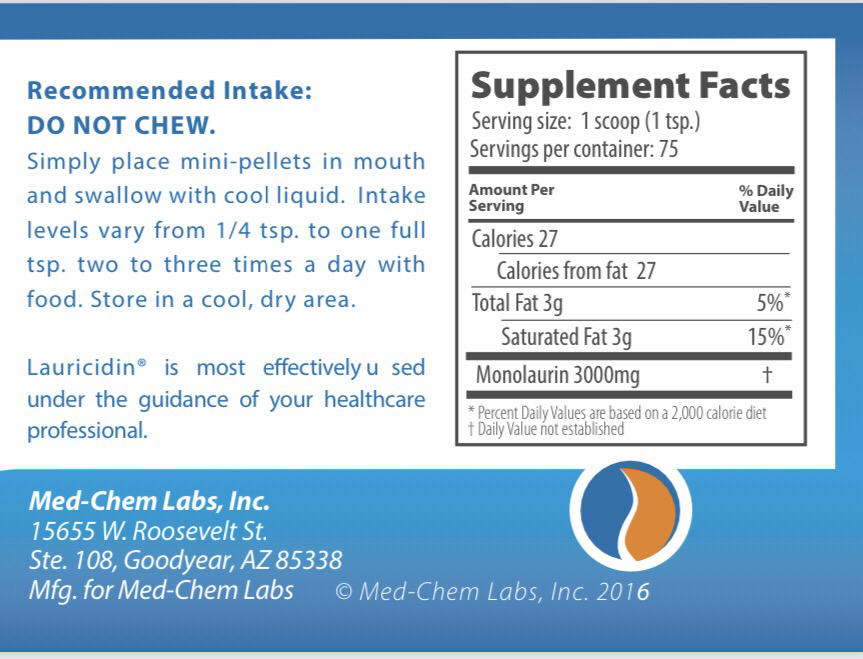 - Вводите лаурицидин® в небольших количествах, пока не достигнете рекомендуемой дозы. Вы можете начать употреблять до 1 отдельной гранулы 3 раза в день, до 1/4-й ложечки 3 раза в день, прежде чем дойдете до 1 ложки 3 раза в день. Принимайте ежедневно так же, как мультивитамин.