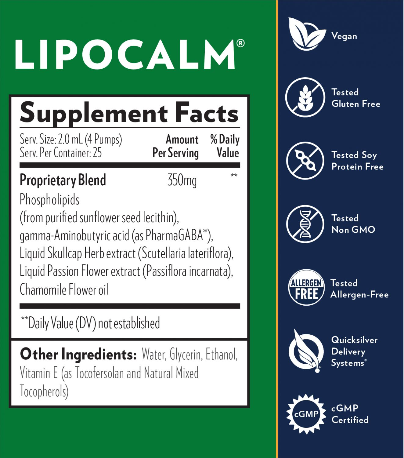 В каждом 2 мл липосомального препарата LipoCalm содержится 350 мг запатентованной смеси гамма-аминомасляной кислоты (в виде PharmaGABA®), жидкого экстракта тюбетейки (Scutellaria lateriflora), жидкого экстракта страстоцвета (Passiflora incarnata) и масла цветков голубой ромашки. Размер порции составляет 4 помпы. Каждый флакон содержит 25 порций.