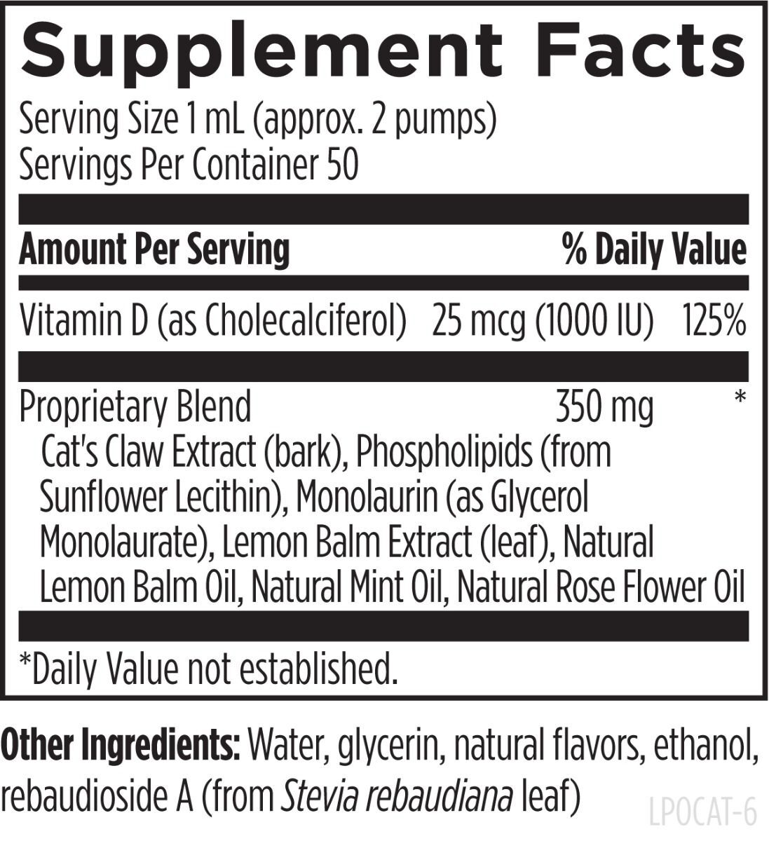 Liposomal Cat's Claw Synergy - это уникальная запатентованная смесь ингредиентов в липосомальной форме для поддержания иммунного баланса и здоровой микробной среды, включающая кошачий коготь, монолаурин, экстракт мелиссы, масла мяты и розы.* Каждая порция из 2 насосов также содержит 25 мкг (1 000 МЕ) витамина D3 для усиления иммунной поддержки.* Этот продукт создан с использованием липосомальной технологии, которая помогает облегчить доставку питательных веществ внутри клеток в целевые ткани, улучшая всасывание и биодоступность.