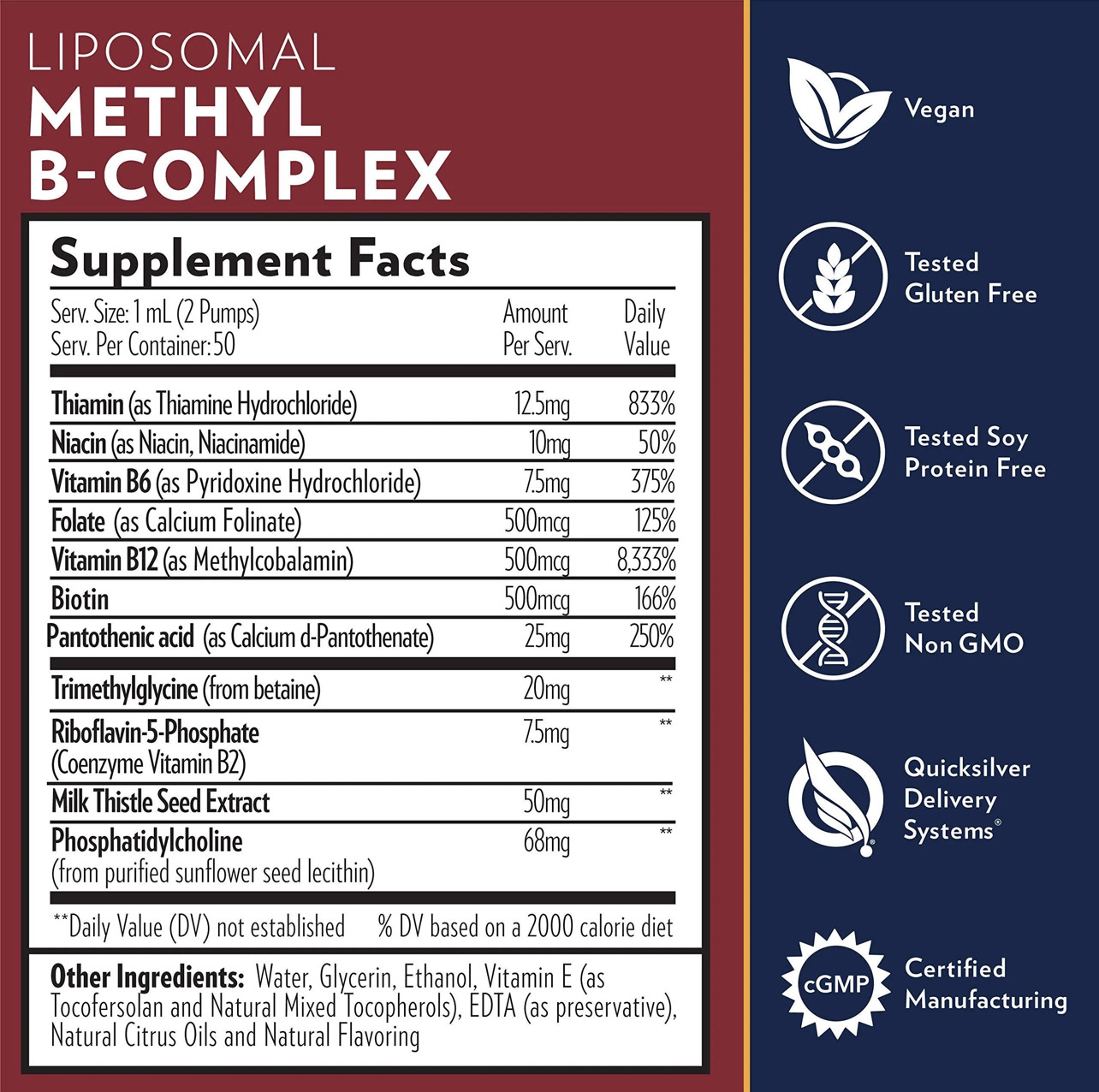 Каждый 1 мл липосомального метилового B-комплекса содержит 12,5 мг В1, 7,5 мг В2, 10 мг В3, 25 мг В5, 7,5 мг В6, 500 мкг В7, 500 мкг В9, 500 мкг В12, 25 мг триметилглицина и 50 мг экстракта расторопши. Порция составляет 2 помпы. Каждая бутылка содержит 50 порций.