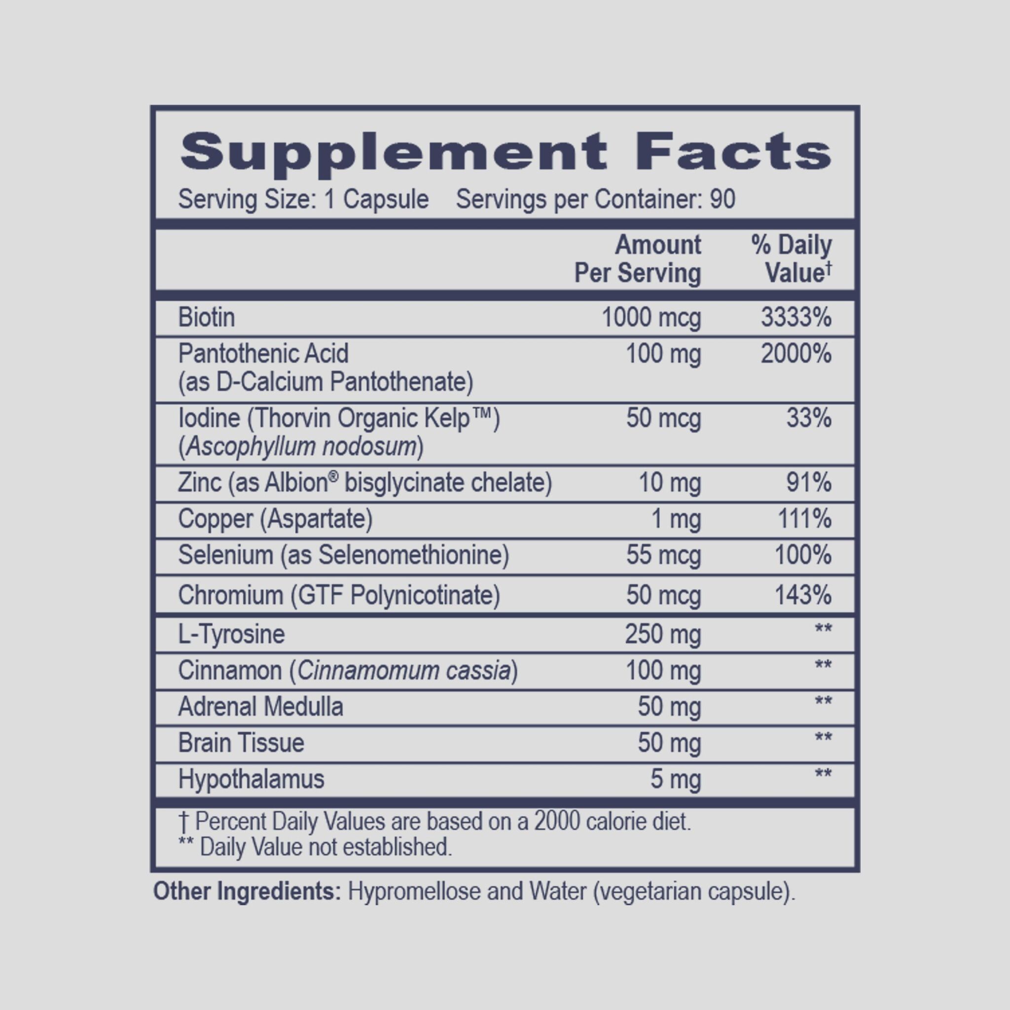 Metabolic Enhancer содержит целевые группы витаминов, минералов, растительных и других натуральных питательных веществ для поддержания здорового обмена веществ. Этот продукт включает в себя: Железистая поддержка из медуллы надпочечников, концентраты неврологических тканей. Катализатор метаболизма - корица. Витамин В5 (D-кальция пантотенат) помогает превращать пищу в энергию, поддерживая метаболизм углеводов, белков и жиров. Кроме того, он важен для иммунной, нервной и желудочно-кишечной систем. Комплекс минералов, хорошо известных своей поддержкой метаболизма глюкозы, работы щитовидной железы, производства клеточной энергии и общего самочувствия. Хорошо сочетается с Eco Thyro 37 и Thyro Complex с щитовидной железой.