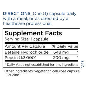 Гидрохлорид бетаина с пепсином, принимаемый во время еды, поддерживает нормальное пищеварение*. Гидрохлорид бетаина может снижать pH (повышать кислотность) содержимого желудка для более эффективного переваривания, тем самым повышая доступность и усвоение иначе связанных питательных веществ*.