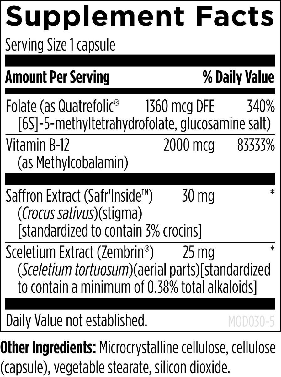 Mood-Stasis™ - это уникальная смесь витаминов и растительных веществ, которые действуют синергетически, поддерживая спокойствие и позитивный настрой ума.* В состав входят экстракты шафрана и сцелетиума, а также метилированные формы витамина B12 и фолата, которые, как было показано, поддерживают нормальную реакцию на стресс.* Рекомендации по применению: принимайте по 1 капсуле в день или по указанию вашего лечащего врача.* Внимание: Если вы беременны, кормите грудью или принимаете антидепрессанты или лекарства от тревоги, проконсультируйтесь с вашим лечащим врачом перед использованием этого продукта.* Эти заявления не были оценены Управлением по контролю качества пищевых продуктов и лекарственных средств. Данный продукт не предназначен для диагностики, лечения, излечения или профилактики каких-либо заболеваний.