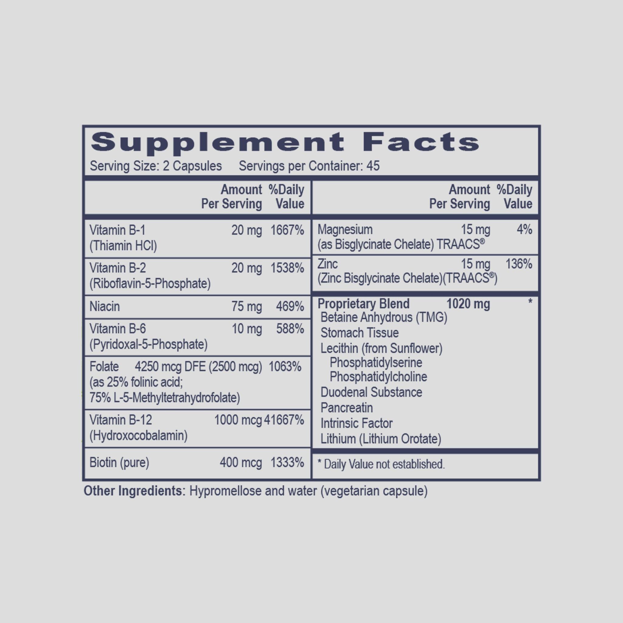 MTHFR & BHMT Assist (METHYL BOOST) обеспечивает поддержку фолатного цикла (MTHFR) и метионинового цикла (BHMT), а также содержит множество важных кофакторов и синергетических питательных веществ. По сравнению с METHYL BOOST +, эта формула обеспечивает меньшее количество метиловой поддержки и имеет следующие особенности: Неметилированная форма витамина B12, гидроксокобаламин, а также меньшее количество бетаина безводного (TMG), витамина B6, фосфатидилсерина и фосфатидилхолина, и небольшое количество ниацина для уменьшения метильных групп. Дополнительные важные витамины, минералы и питательные вещества, такие как витамин B1, B2, B6, биотин, хелатированные магний и цинк TRAACS ®, литий, панкреатин и новозеландские железы.