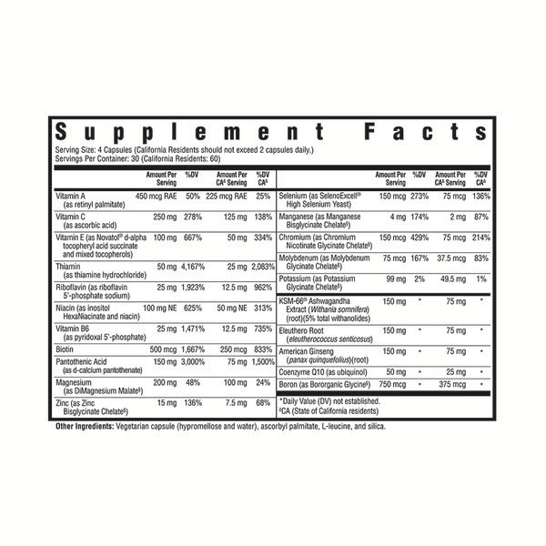 Растительные экстракты обеспечивают дополнительную поддержку этой мультивитаминной и минеральной смеси. Уникальная смесь адаптогенных трав, включая ашваганду и элеутерококк, может усилить здоровую реакцию организма на стресс, помогая поддерживать здоровые надпочечники. Жирорастворимые витамины А и Е, мощная доза витамина С и 50 мг CoQ10 могут помочь обеспечить поддержку антиоксидантной и иммунной систем организма.*