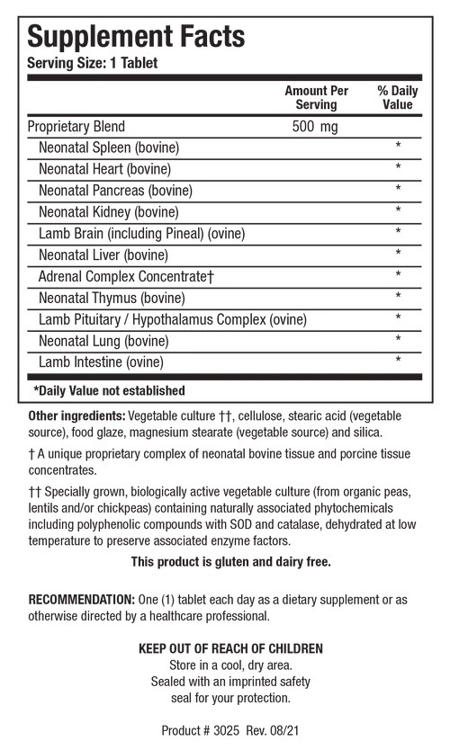 Neonatal Multi-Gland™ представляет собой широкий спектр концентратов органов и желез. Он включает в себя неонатальную селезенку, сердце, поджелудочную железу, почки, мозг, печень, надпочечники, тимус, комплекс гипофиза/гипоталамуса, легкие и кишечные железы. С начала 1980-х годов компания Biotics Research находится на переднем крае производства железистых препаратов, что отражает ее стремление к исследованиям и инновациям. Железы от Biotics Research заготавливаются строго из стран, свободных от BSE, и собираются под контролем Министерства сельского хозяйства США. В состав железок Neonatal Multi-Gland™ входят ткани новорожденных телят, собранные специально для Biotics Research, чтобы обеспечить качество и воспроизводимый источник бычьих тканей. Ткани новорожденных животных обладают высокой анаболической активностью и подвергались минимальному воздействию стрессовых факторов окружающей среды. В тканях новорожденных телят не наблюдается атрофии, жировой инфильтрации, деградации тканей и накопления продуктов окислительного распада (липофусцина). Железы получают путем обработки мягкими растворителями и при низких температурах; известно, что в этих условиях сохраняются ферменты, белки и полипептиды.