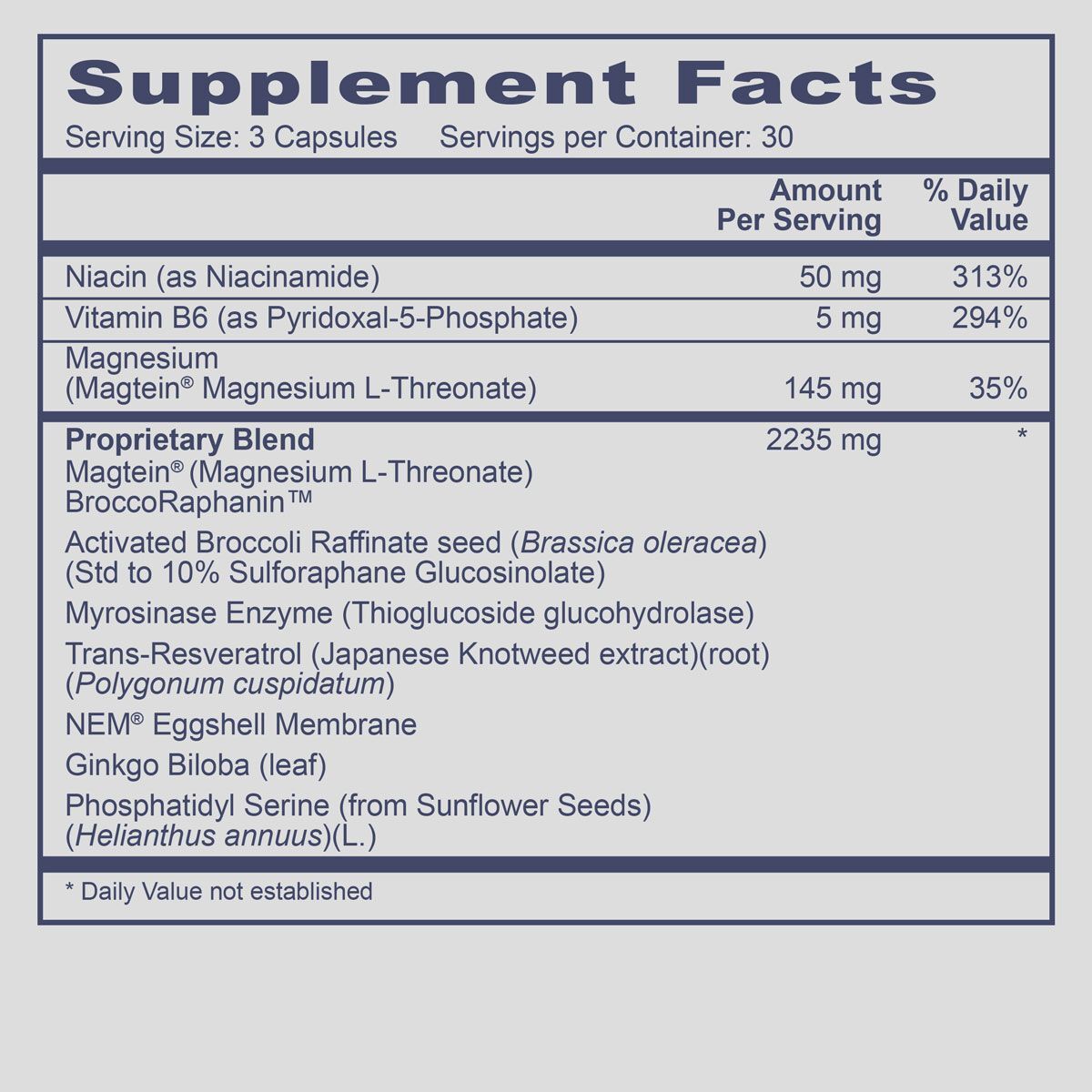 Neuro Nutrients содержит мощную комбинацию ключевых витаминов, минералов, растительных экстрактов и аминокислот для поддержки неврологических функций. В состав этого эффективного продукта входят: Magtein ® (Magnesium L-Threonate) - уникальная запатентованная форма магния, которая является единственной формой этого важнейшего минерала, способной преодолевать гематоэнцефалический барьер, тем самым обеспечивая поддержку когнитивного здоровья и функции мозга. Большое количество витамина B3 в виде ниацинамида и B6, обеспечивающих поддержку сердца, здорового уровня липидов в крови и нервов. Запатентованная смесь питательных веществ, доказавших свою эффективность в борьбе с окислительным стрессом и поддержке неврологического здоровья - BroccoRaphaninTM - фирменная форма сульфорафана с ферментом мирозиназой для полноценного здоровья; транс-ресвератрол из японского узловатого дерева; фосфатидилсерин гинкго билоба SmartPS ® - фосфолипид, важный строительный блок для здоровых и функциональных клеток мозга.