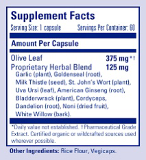 Экстракт оливковых листьев (органический, минимальное содержание олеуропеина 18-24%), 125 мг комбинации из следующих компонентов: чеснок (растение), золотой злак (корень), расторопша (семя), зверобой (растение), Ува-урси (лист) ), Американский женьшень (корень), Bladderwrack (растение), кордицепс, одуванчик (корень), нони (сухофрукты), белая ива (кора).