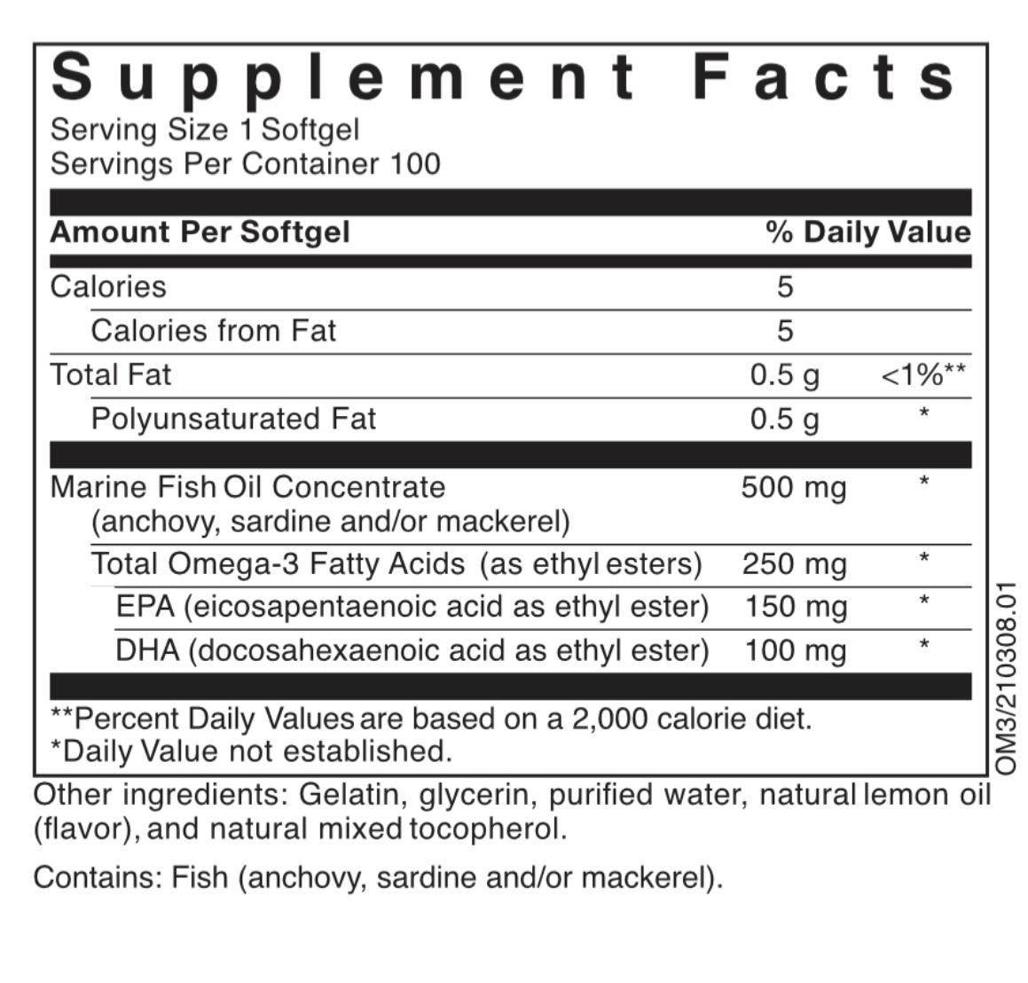 Каждая 1 г капсула содержит гарантированное минимальное количество 300 мг EPA и 200 мг DHA (270 мг EPA/180 мг DHA, если они представлены в виде эквивалентов свободных жирных кислот). Морской рыбий жир - это продукт, не имеющий рыбного запаха или послевкусия. Смешанные токоферолы витамина Е поддерживают свежесть, замедляя перекисное окисление липидов, сохраняя легкий, чистый вкус. Каждая партия мягких капсул анализируется независимой испытательной лабораторией для проверки чистоты масла и эффективности омега-3.