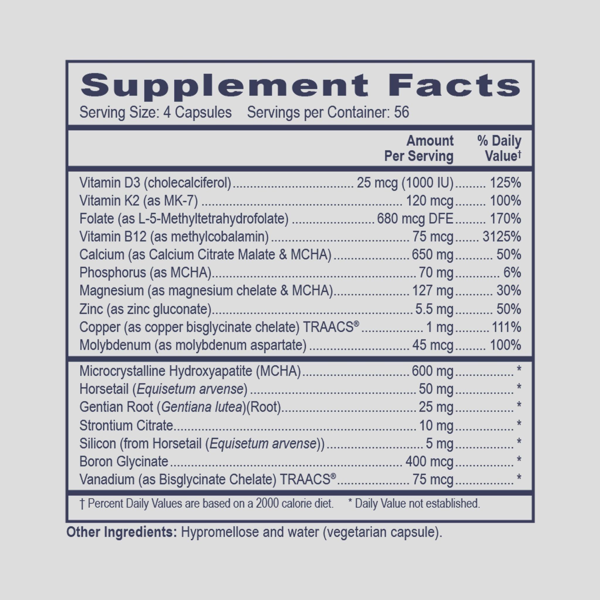 Osseoapatite Plus содержит смесь важных питательных веществ и отборных трав, которые поддерживают метаболизм и здоровье костей. В состав этого бестселлера входят: Микрокристаллический гидроксиапатит (MCHA) - это экстракт из лиофилизированного матрикса костной ткани теленка. Исследования показали, что это чрезвычайно биодоступная форма кальция, которая может помочь предотвратить потерю костной массы и восстановить содержание минералов в костях. Витамины, необходимые для поддержания здоровья костей, включают витамин D3 из ланолина, а также синергически поддерживающий витамин K2 в виде MK-7. Высокодоступные формы фолата в виде L-5-метилтетрагидрофолата и витамина B12 в виде метилкобаламина. Полная минеральная смесь, поддерживающая костную ткань: фосфор, стронций, кремний, бор, магний, цинк, медь, молибден и ванадий.