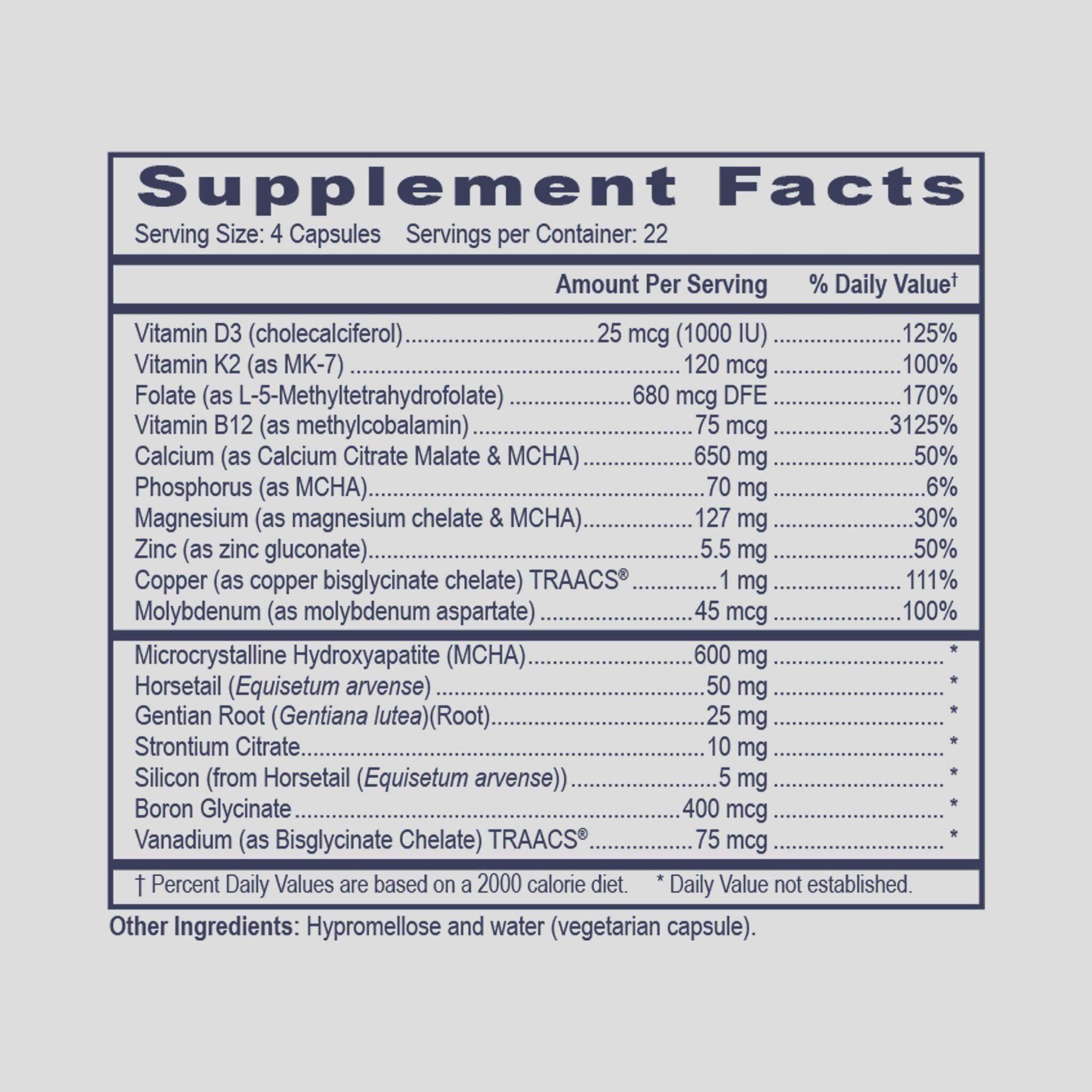 Osseoapatite Plus содержит смесь важных питательных веществ и отборных трав, которые поддерживают метаболизм и здоровье костей. В состав этого бестселлера входят: Микрокристаллический гидроксиапатит (MCHA) - это экстракт из лиофилизированного матрикса костной ткани теленка. Исследования показали, что это чрезвычайно биодоступная форма кальция, которая может помочь предотвратить потерю костной массы и восстановить содержание минералов в костях. Витамины, необходимые для поддержания здоровья костей, включают витамин D3 из ланолина, а также синергически поддерживающий витамин K2 в виде MK-7. Высокодоступные формы фолата в виде L-5-метилтетрагидрофолата и витамина B12 в виде метилкобаламина. Полная минеральная смесь, поддерживающая костную ткань: фосфор, стронций, кремний, бор, магний, цинк, медь, молибден и ванадий.