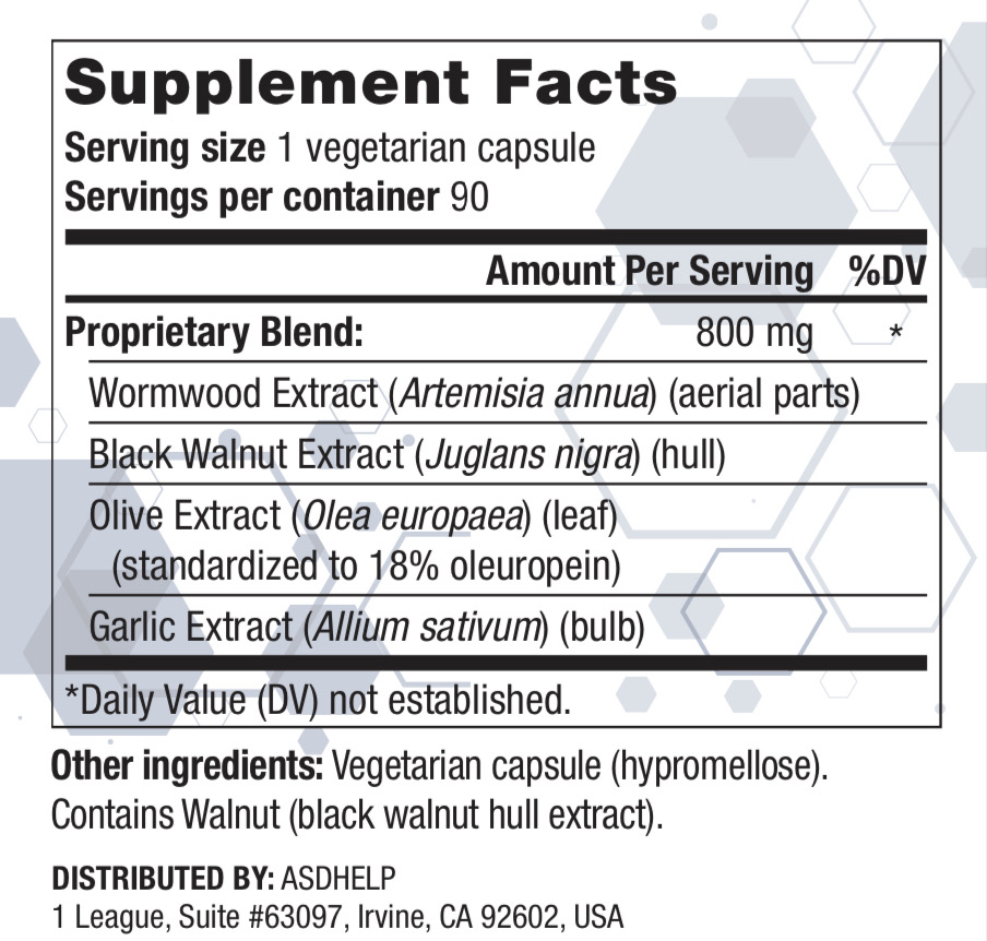 Эта формула дает мощную комбинацию из четырех хорошо изученных растителей в синергетической смеси. Экстракты полыни и черного ореха являются двумя ключевыми ингредиентами, которые повышают его эффективность.