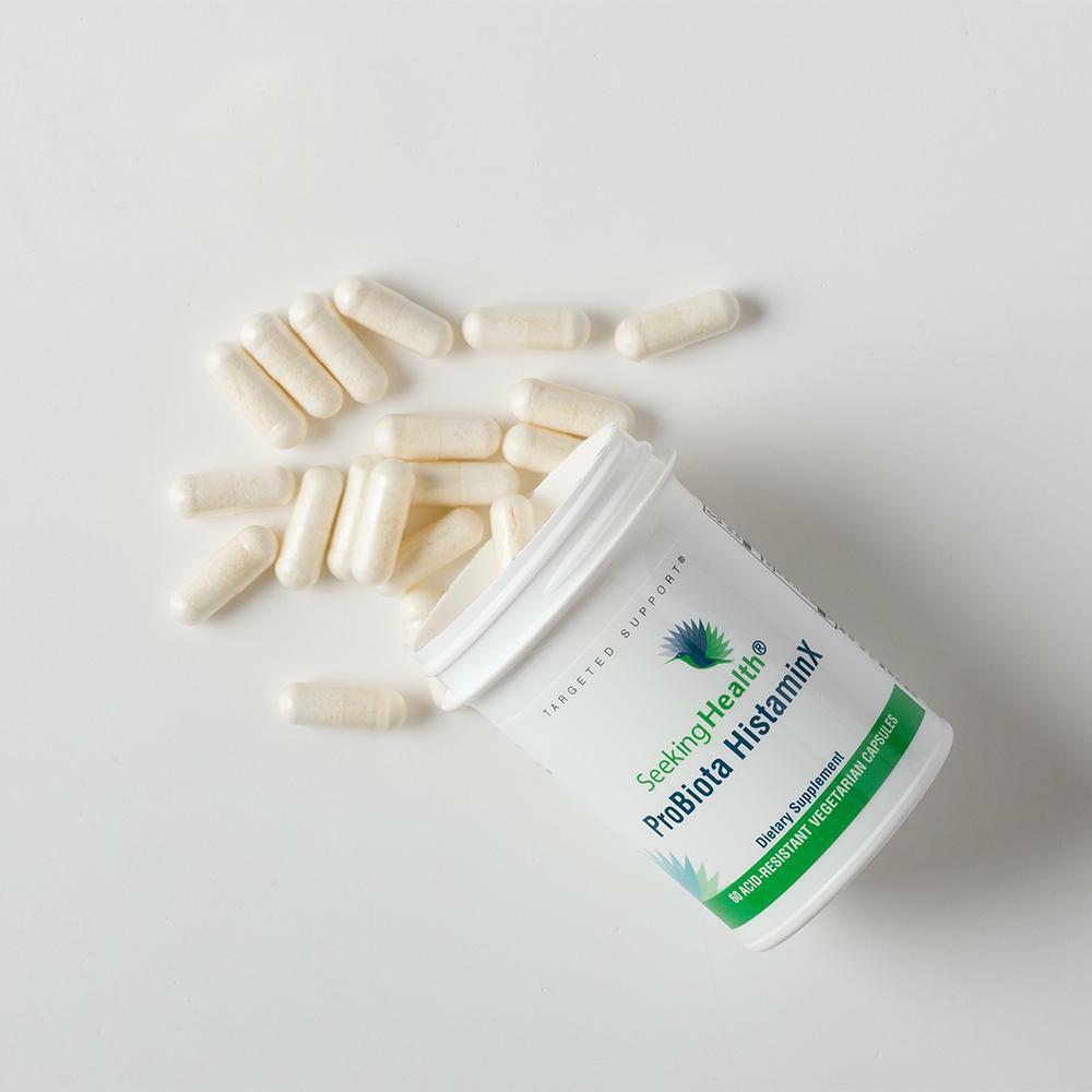 Бактерии, составляющие микробиом в кишечнике человека, служат многим специализированным целям. Считается, что избирательное дополнение популяций определенных видов пробиотиков может изменить уровень конечных продуктов ферментации в кишечнике и поддержать конкретные цели в области здравоохранения. Хотя верно, что некоторые бактерии, обнаруженные в здоровом кишечнике, ответственны за превращение гистидина в гистамин, что может быть проблематично у людей с непереносимостью гистамина, другие могут помочь разрушить гистамин и другие биогенные амины и укрепить здоровый барьер кишечника. Это может представлять особый интерес для людей с чувствительностью или непереносимостью гистамина, поскольку повышенная проницаемость кишечника может позволить большему количеству проглоченного гистамина проходить из кишечника в кровоток. ProBiota HistaminX содержит только те виды пробиотиков, которые считаются "дружественными к гистамину", и исключает те, которые, как известно, производят гистамин в кишечнике.*