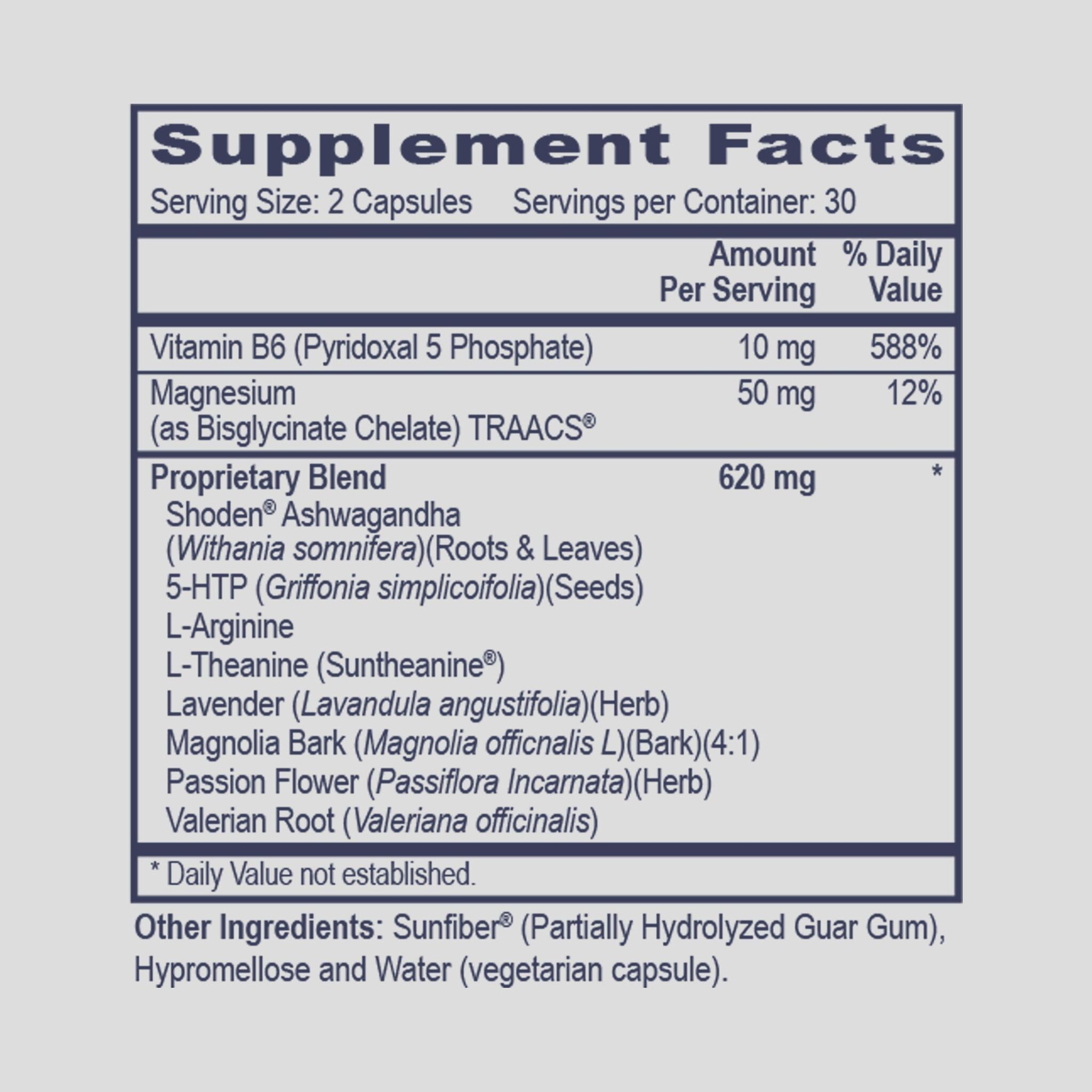 В состав Rest & Reset входят ашвагандха Shoden ®, SunTheanine ® и другие ключевые питательные вещества, которые способствуют спокойному сну и расслаблению с помощью различных биологических механизмов.‡ Клинически доказано, что ашвагандха Shoden ® улучшает восстановительный сон, качество сна и настроение, а также способствует спокойствию и повышает устойчивость к стрессу.‡ L-теанин из SunTheanine ® - уникальная аминокислота, содержащаяся в зеленом чае, которая снимает тревожность и помогает организму расслабиться, оптимизируя естественный нейрохимический "холодок" GABA. Этот нутриент также улучшает расслабляющие альфа-волны мозга, поддерживая познание и концентрацию внимания, иммунную функцию и кровяное давление.‡ Витамин B6 в коферментной форме (пиридоксаль-5-фосфат), поэтому организму не нужно фосфорилировать его, чтобы использовать для преобразования глутамата в ГАМК.‡ Магний в легко усваиваемой форме - бисглицинат хелат от Albion ® . Этот важнейший минерал участвует в более чем 300 процессах, связанных с ферментами, а также поддерживает способность организма к релаксации.‡ L-аргинин преобразуется в организме в оксид азота, мощный вазодилататор, улучшающий кровоток и стимулирующий выделение гормона роста. Эта аминокислота также помогает организму выводить аммиак.‡ 5-Гидрокситриптофан (5-HTP) - аминокислота, которая преобразуется в организме в серотонин, нейромедиатор, участвующий в здоровом настроении и полноценном сне.‡ Смесь успокаивающих и расслабляющих трав - кора магнолии, корень валерианы, лаванда и пассифлора.